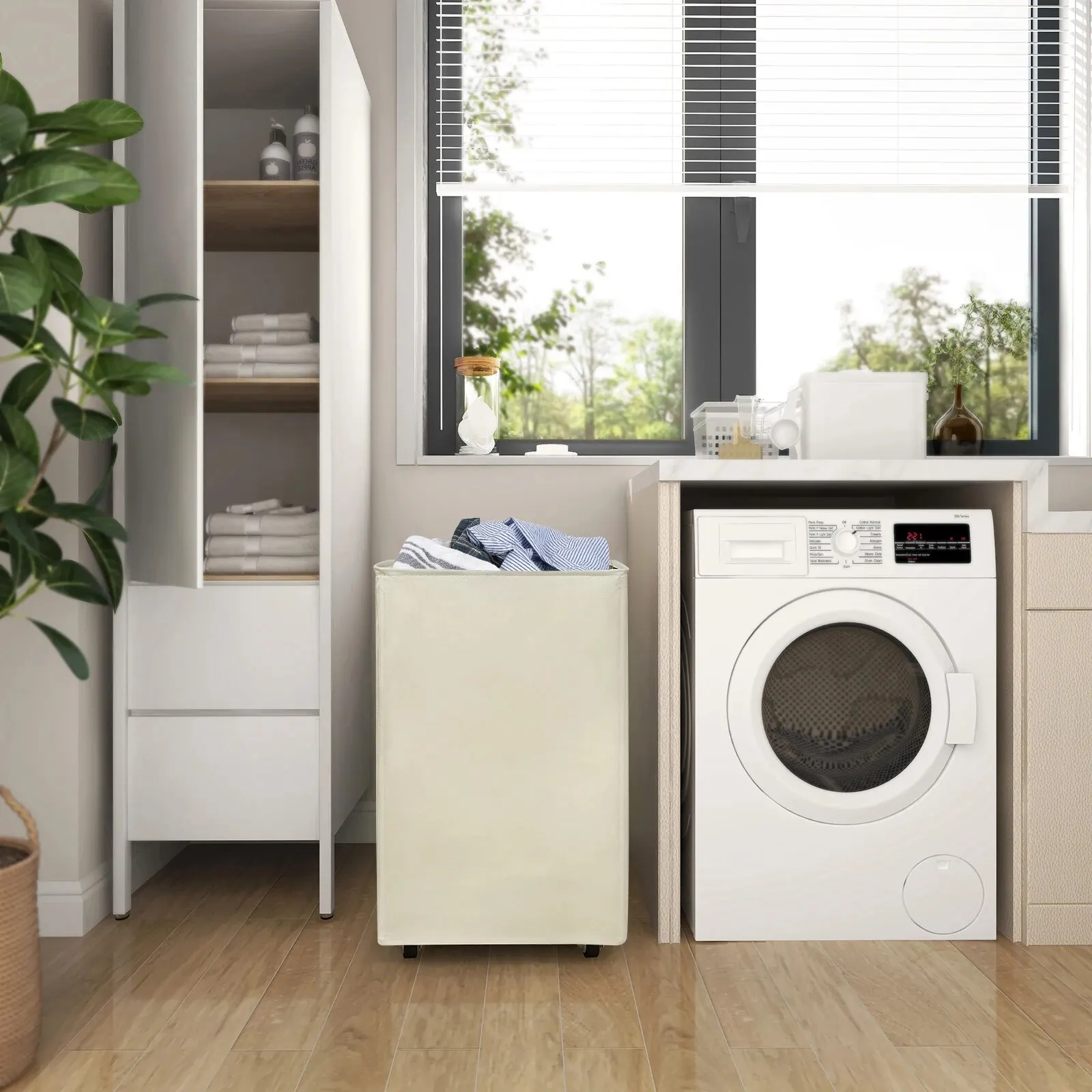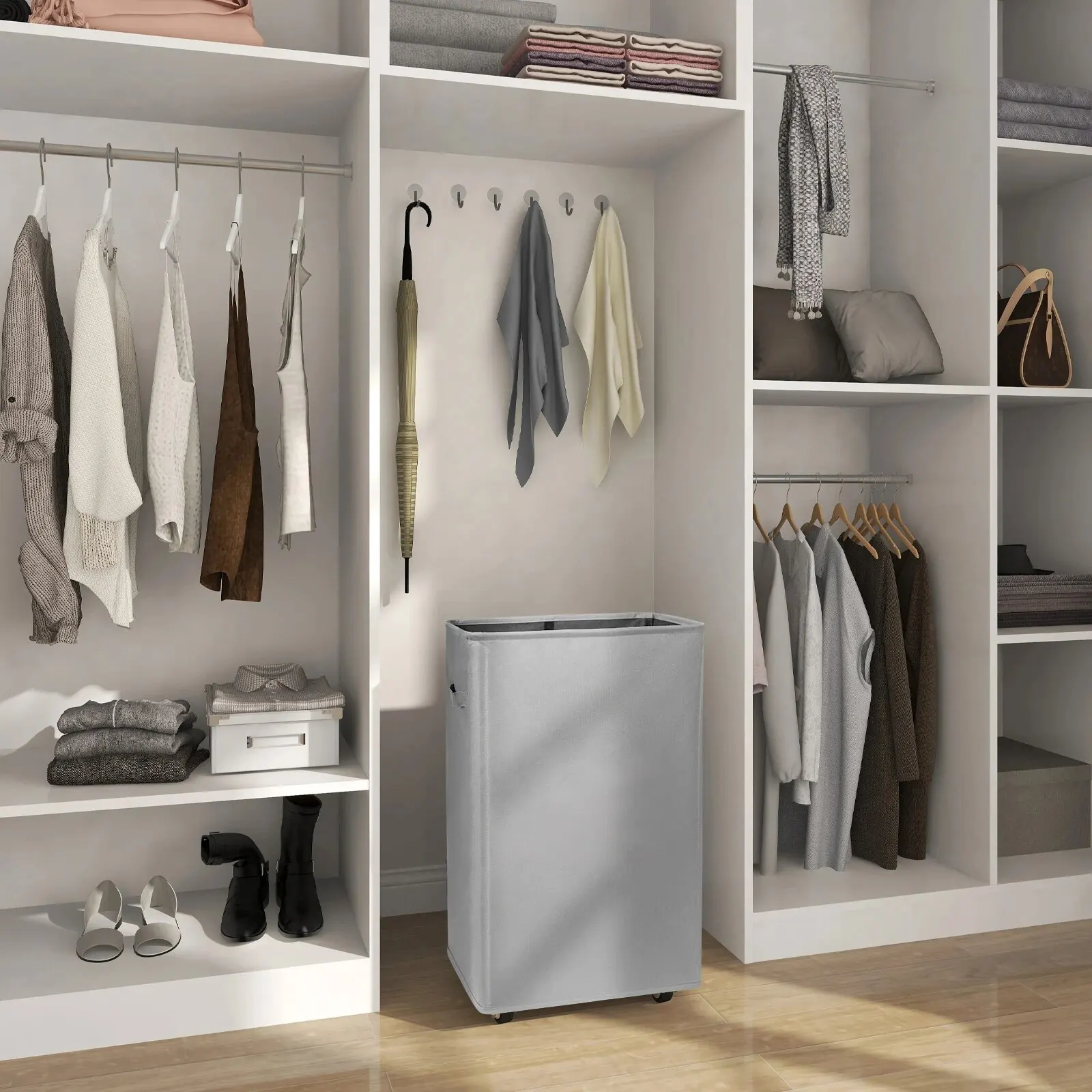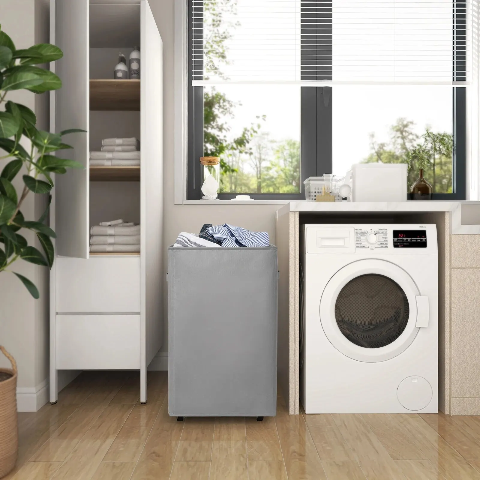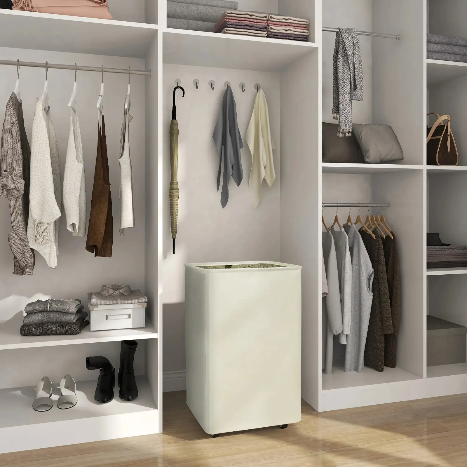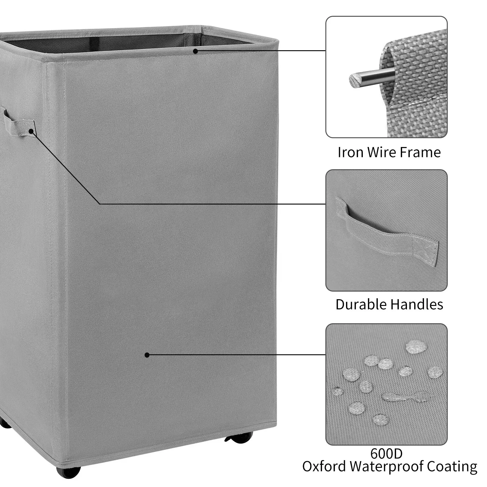 This content describes a large capacity laundry basket with wheels, suitable for use in various places such as the bedroom, Waschraum, Kleiderschrank, Badezimmer, and dormitory. It has a volume of 90 liters and can hold up to 23.78 gallons of laundry. The wheels make it easy to move around, allowing for convenient transport from room to room. Perfect for storing and transporting large amounts of laundry, this basket is a practical and efficient solution for keeping your living space organized and tidy.