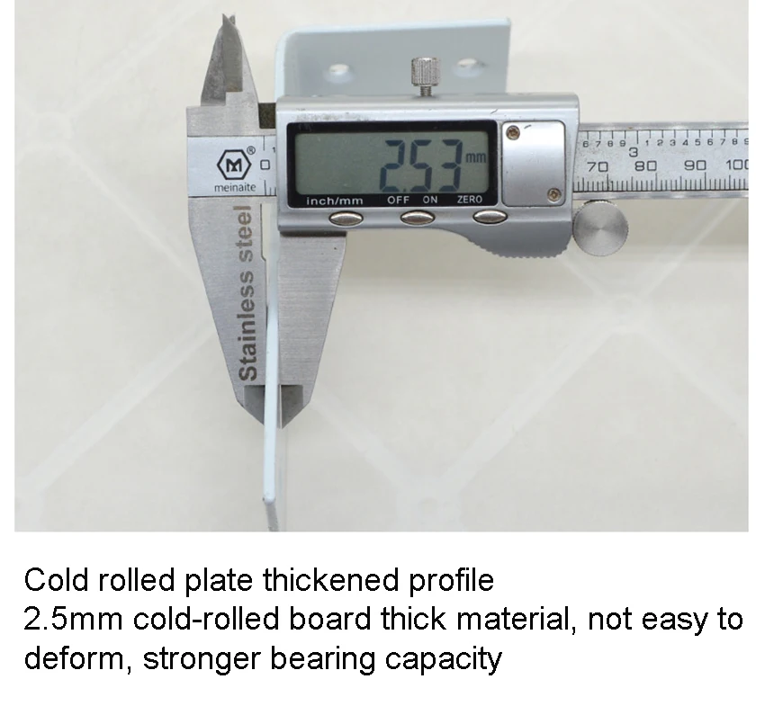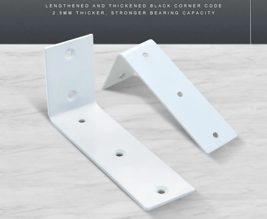 This content describes a large corner shelf bracket made of 2.5mm thick angle iron in a 90-degree right angle. It is designed with a fixed lengthened angle for extra support and stability. The L-shaped triangle bracket is suitable for supporting shelves securely in place.