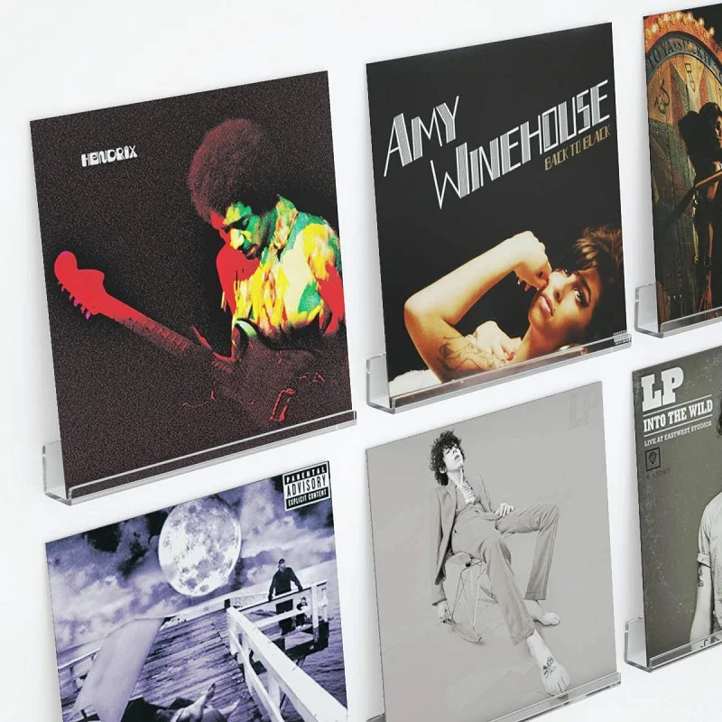 This content describes a set of acrylic record display stands that can hold 2, 6, oder 8 vinyl records each. The stands are designed to securely hold 12-inch records and can be mounted on a wall for easy display. These shelves are ideal for organizing and storing LP record albums, keeping them safely stored and easily accessible. The clear acrylic material allows for the artwork on the records to be visible while they are displayed. Gesamt, these stands offer a stylish and practical solution for showcasing a collection of vinyl records.