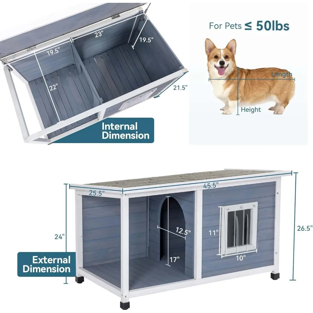 - [Outdoor Dog House Weatherproof] The dog house outdoor is made of solid fir wood and ultra-weather-resistant asphalt roofing, which is strong and durable enough. Pre-assembled holes make assembly easier. Adjustable feet help the dog house stay stable on uneven outdoor surfaces.