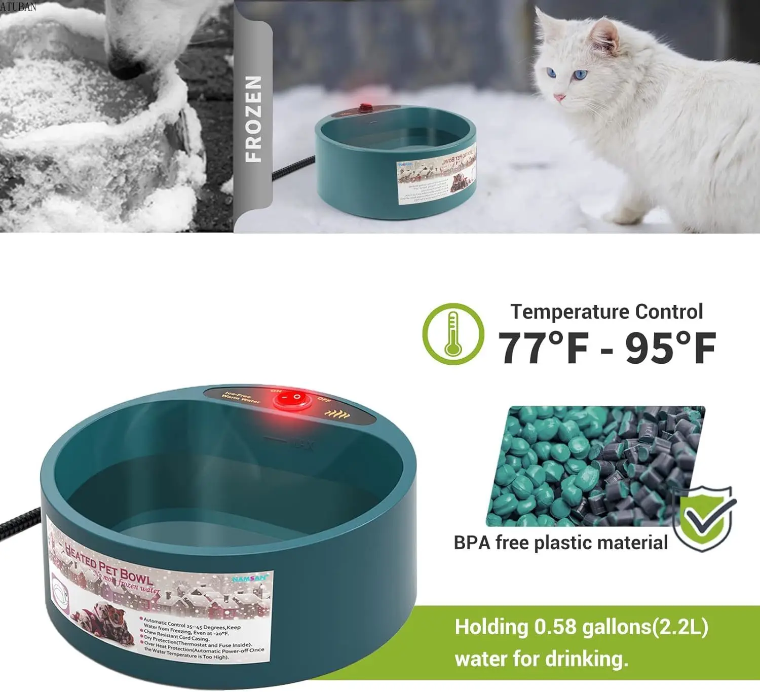 ATUBAN focus on researching pet supplies, this heated pet bowl is authorized by ATUBAN, which made of quality BPA free plastic material, no harmful substances are generated when heating, it can be used outdoors or indoors, anywhere in winter.