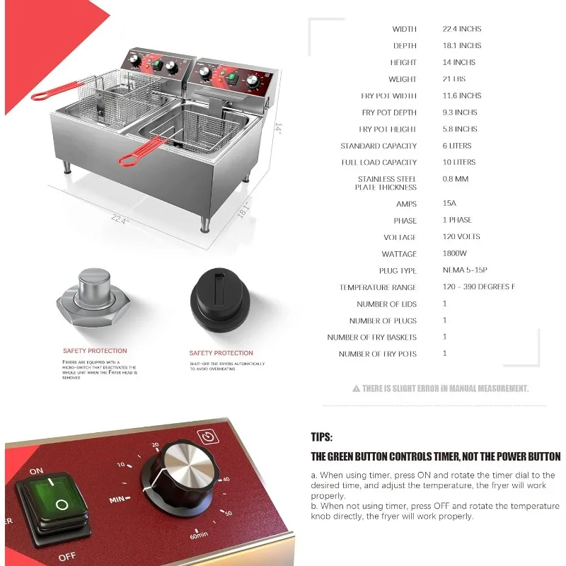 - TEMPERATURE AND TIMER CONTROL – This deep fryer features temperature control function and 60 minutes timer, the temperature control goes up to 390°F (200° C), you can set the optimal temperature depending on what you cook. An installed guard plate effectively balances oil temperature and ensures food is fried evenly. The fryers will automatically shut off when the temperature is over 240°C (464° F)