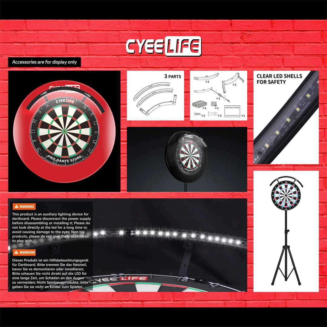 The CyeeLife 120 Degree Dartboard Lighting is designed with a magnetic clamp and emits a warm white light. It is suitable for circular dart plates, providing optimal illumination for playing darts. The 120-degree angle of the lighting ensures full coverage of the dartboard, making it easier to see and hit the targets. The magnetic clamp allows for easy installation and removal, making it convenient to use. Gesamt, the CyeeLife Dartboard Lighting is a practical and effective solution for enhancing visibility and enjoyment during dart games.