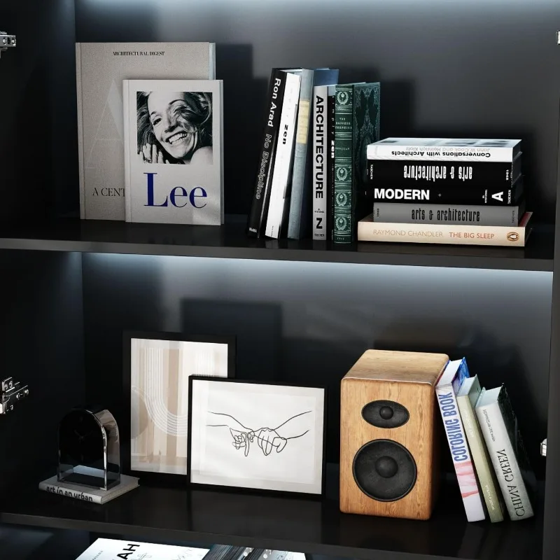 - Pop-up Glass Doors – This modern display cabinet features 2 large glass doors with a pop-up device, offering convenience and a modern experience. Simply press gently and it will pop up automatically. Adjust the sensitivity by rotating the device’s knob.