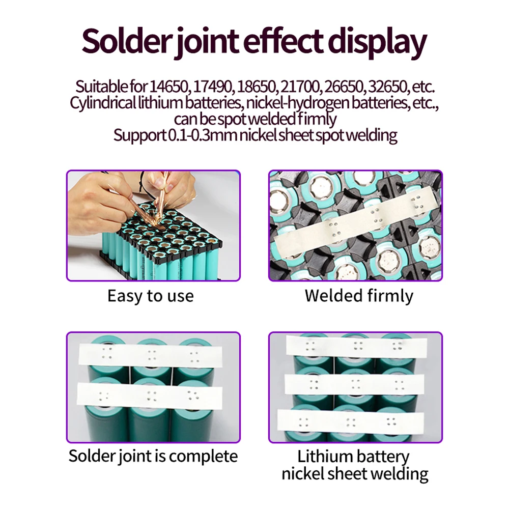 6. This product can be widely used on spots welding cylindrical lithium batteries and nickel metal hydride batteries such as 14650/17490/18650/21700/26650/32650 usw.