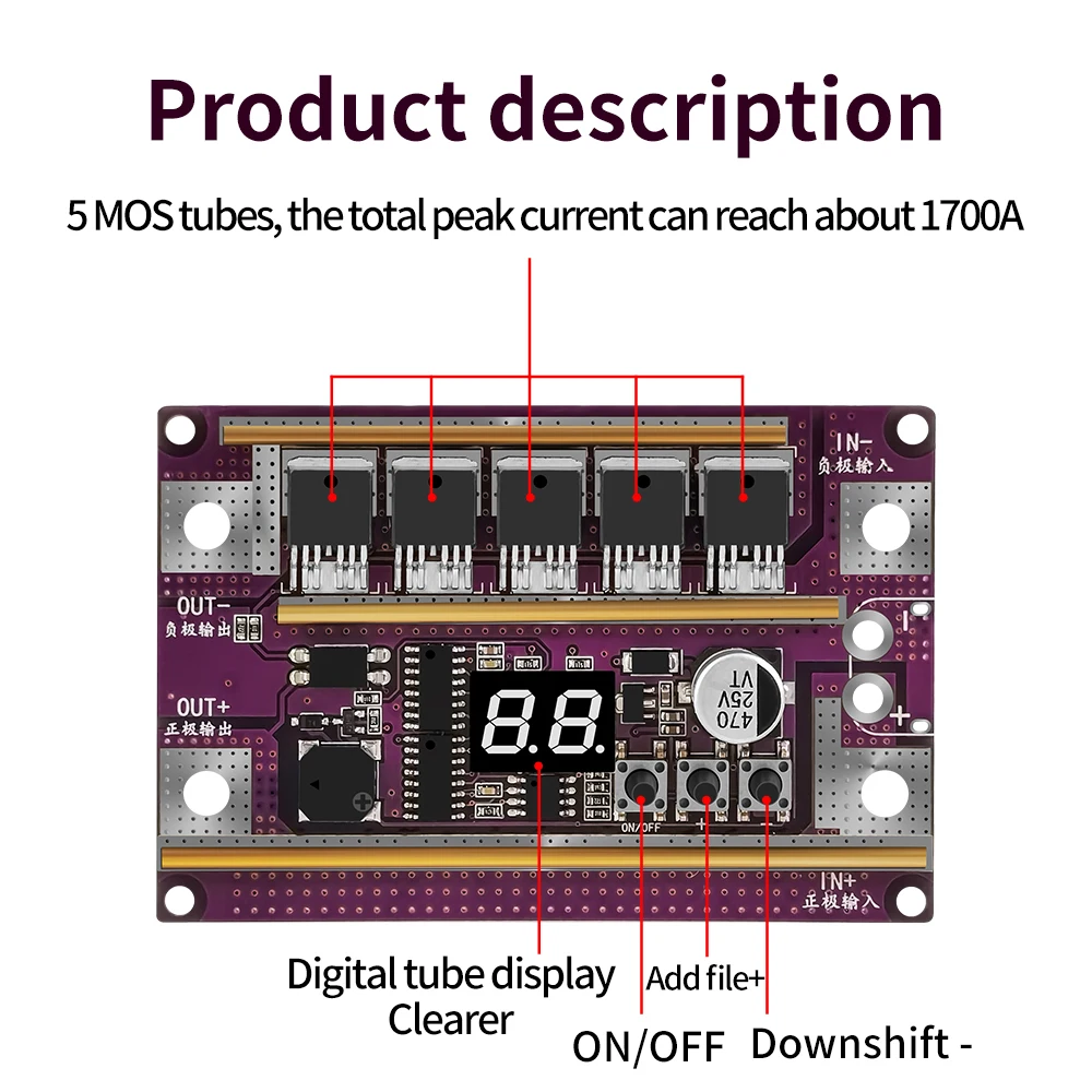 2. Adopt 5pcs MOS tubes, and the maximum current is up to 1700A; es gibt 5 MOS tube locations reserved on the back of the printed circuit board for DIY players to increase their own MOS tubes.