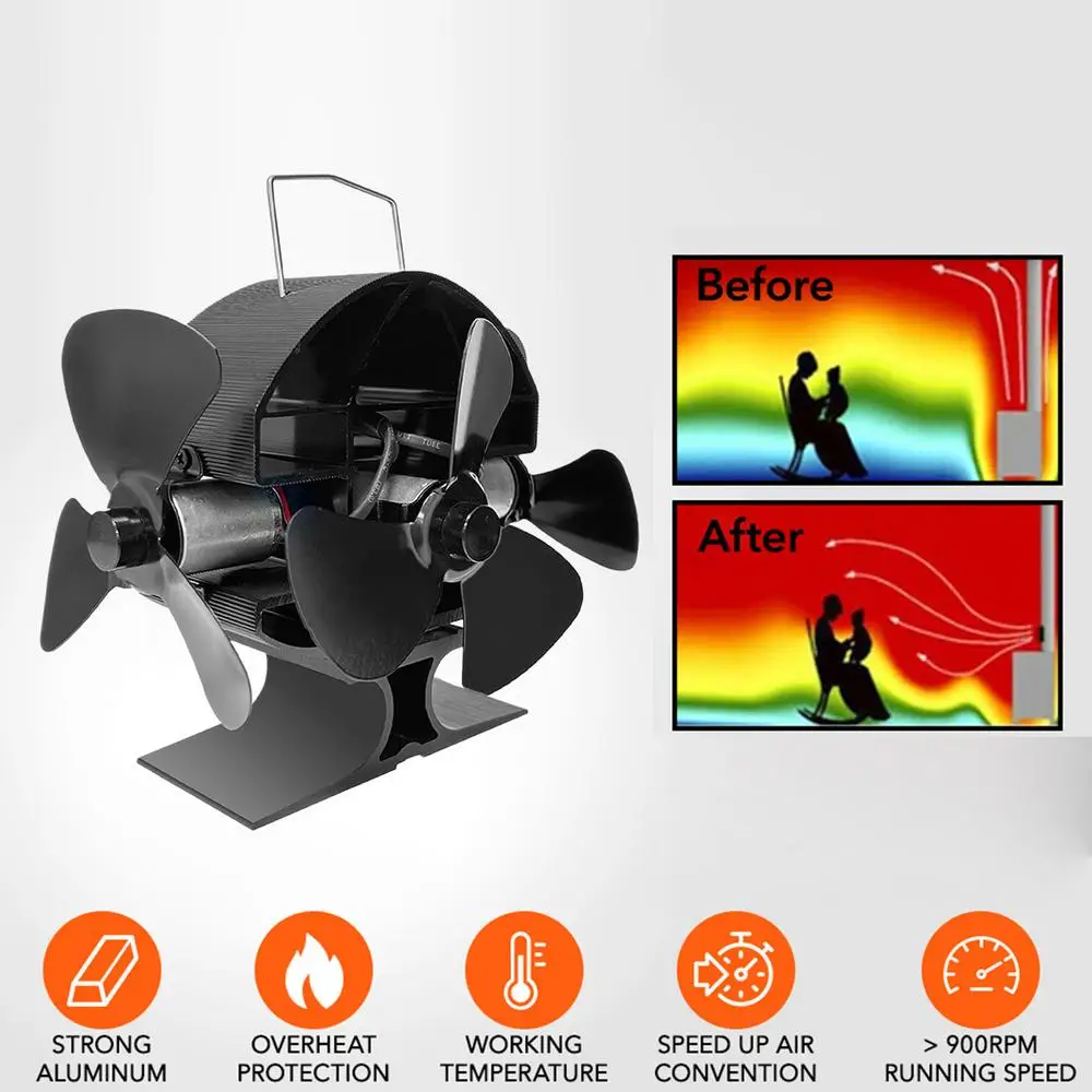 5.Hochwertiges Material: The wood stove fan is made of anodized aluminum material, which has high thermal conductivity, rust-proof and wear-resistant properties. It can be used for a long time without any damage or deformation.