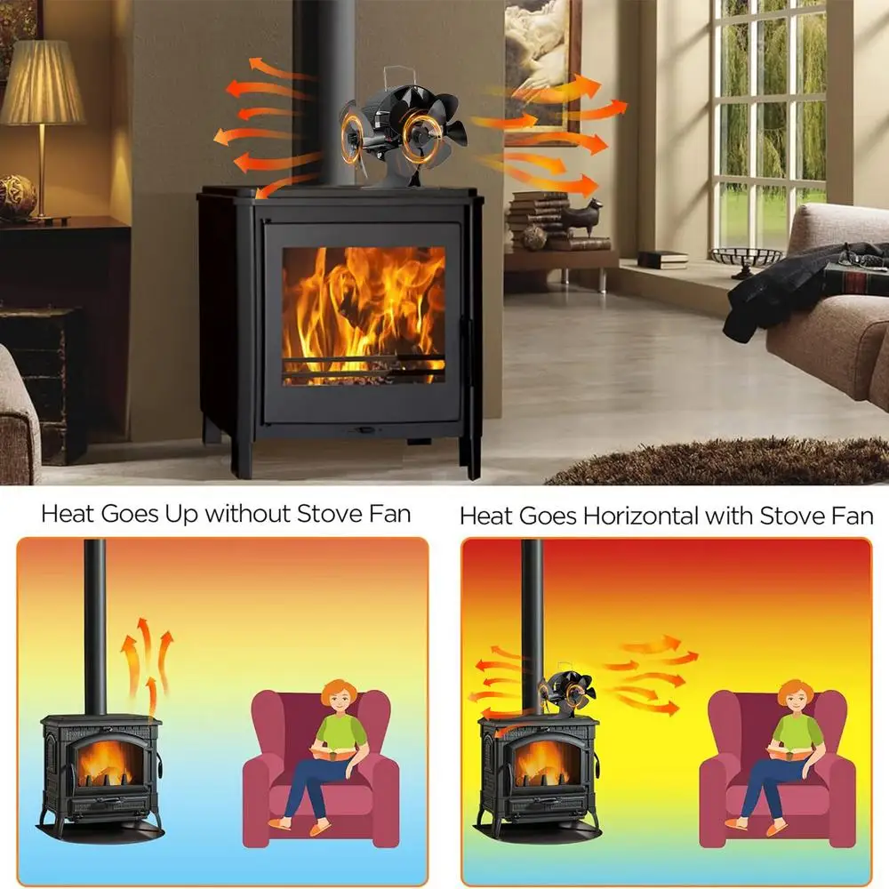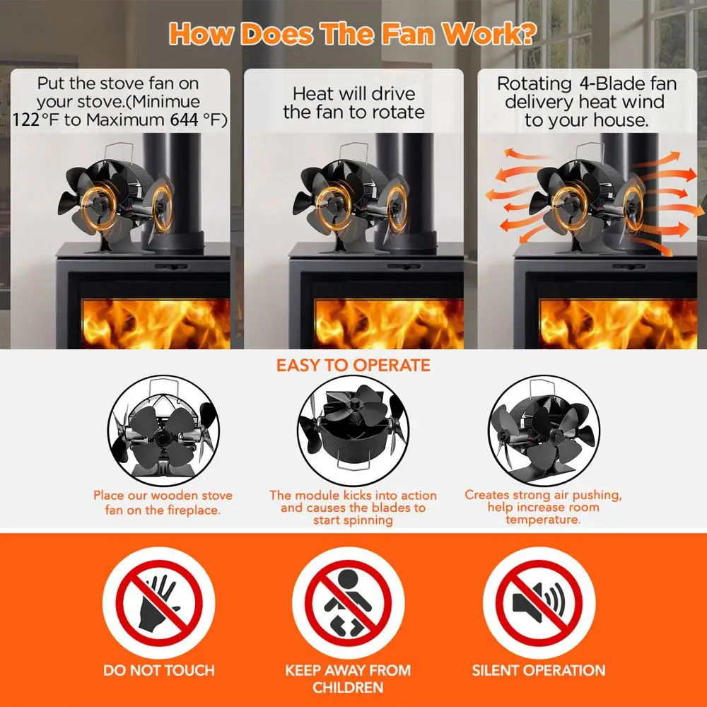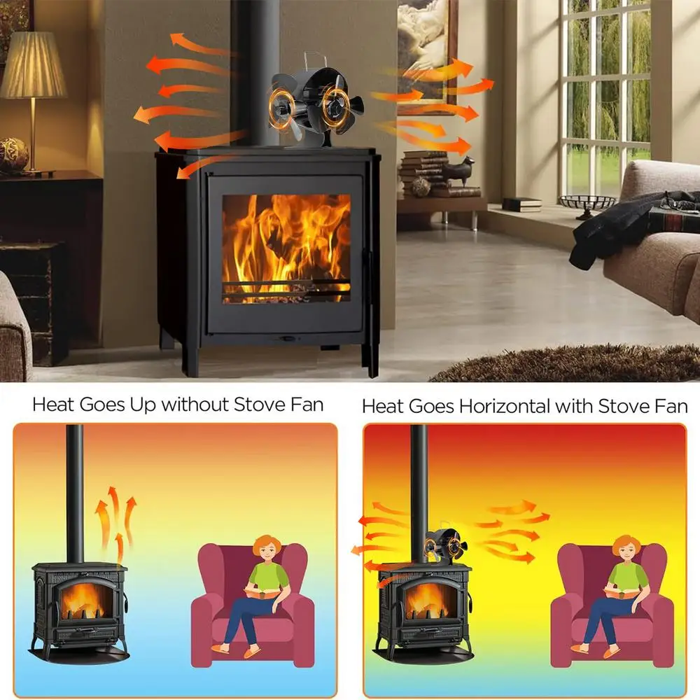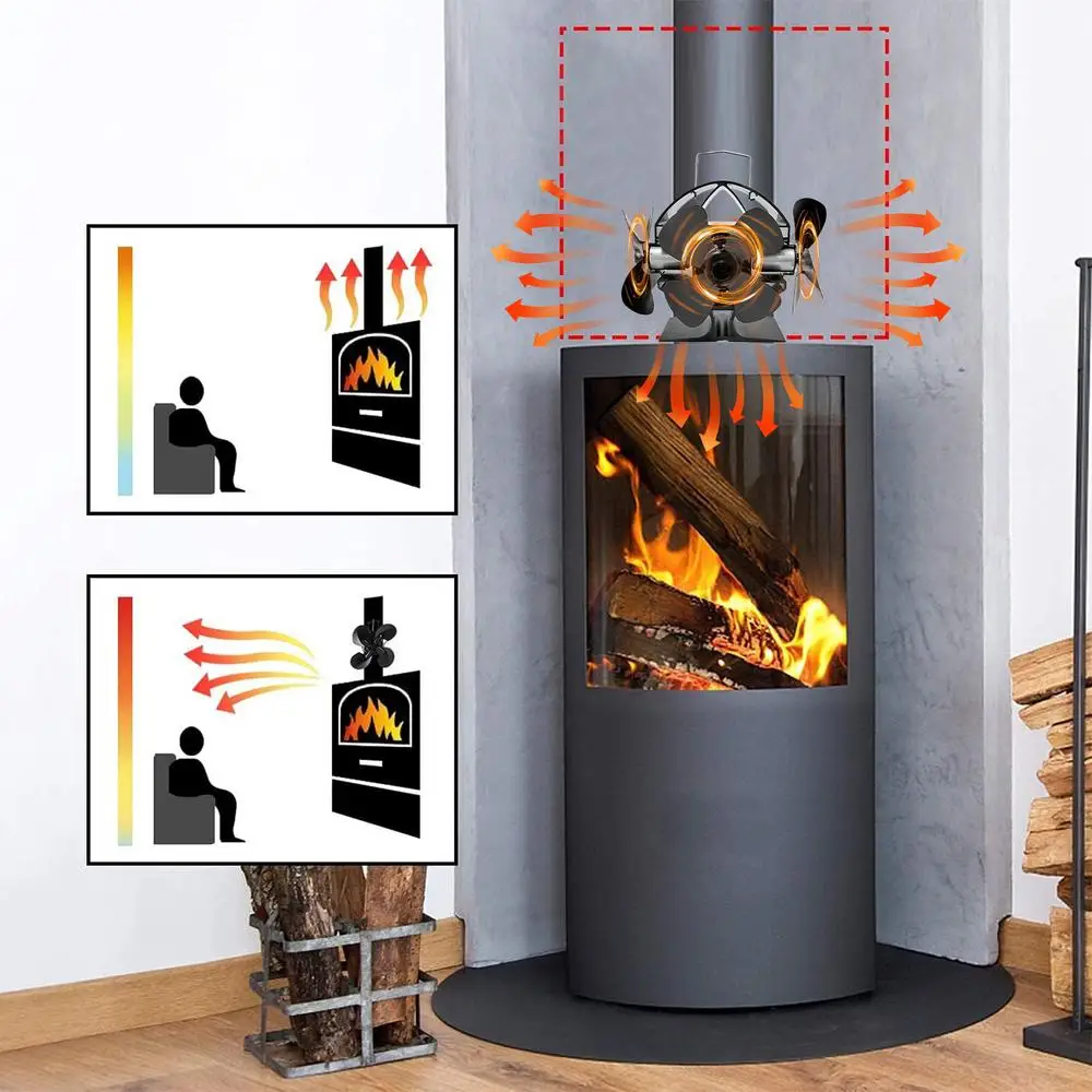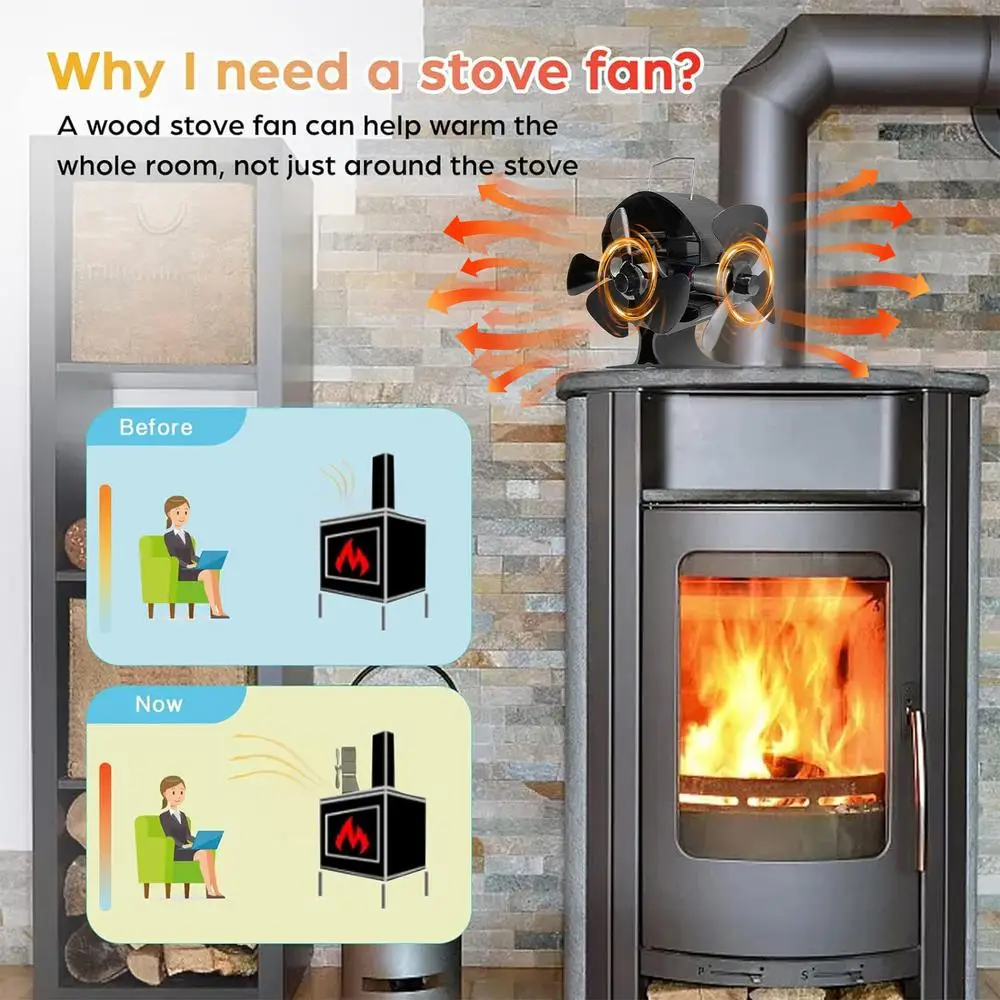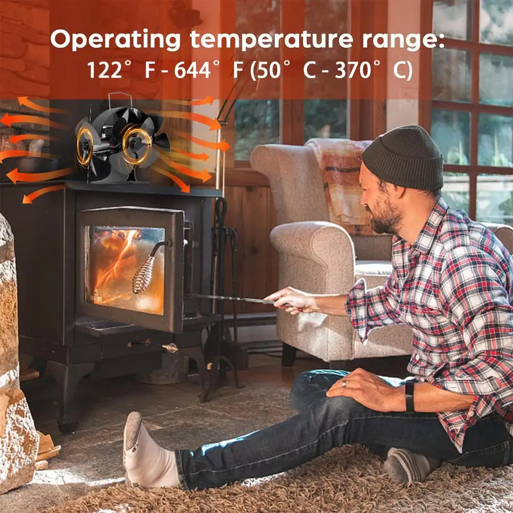 2.Energieeinsparung: This wood stove fan is heat powered, which means it does not need any batteries or electricity to operate. It uses the heat from your wood stove to generate its own power and circulate warm air throughout your room.