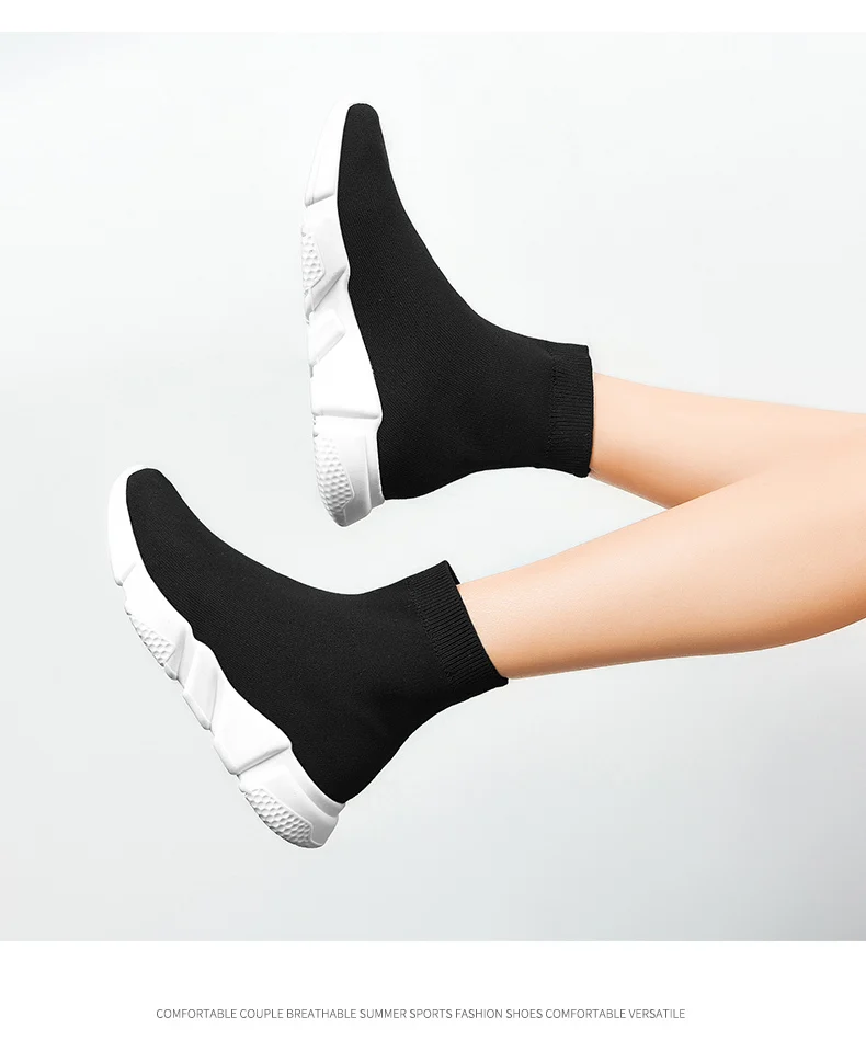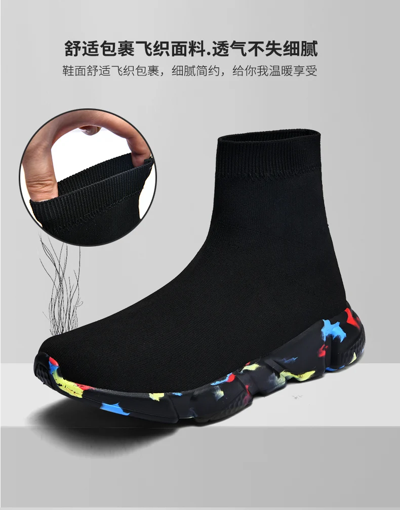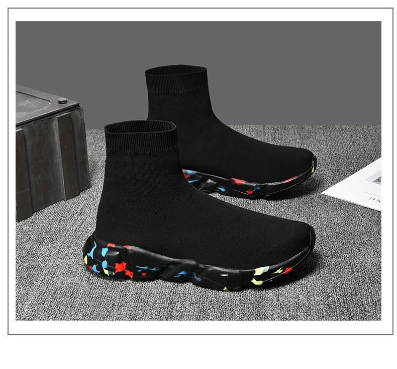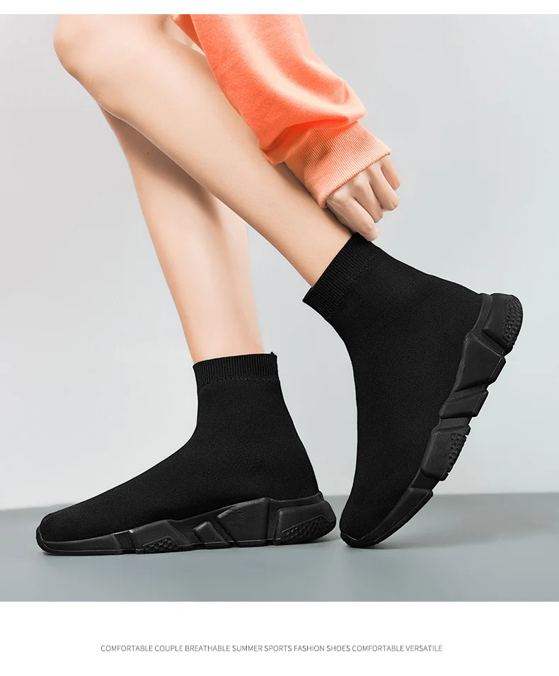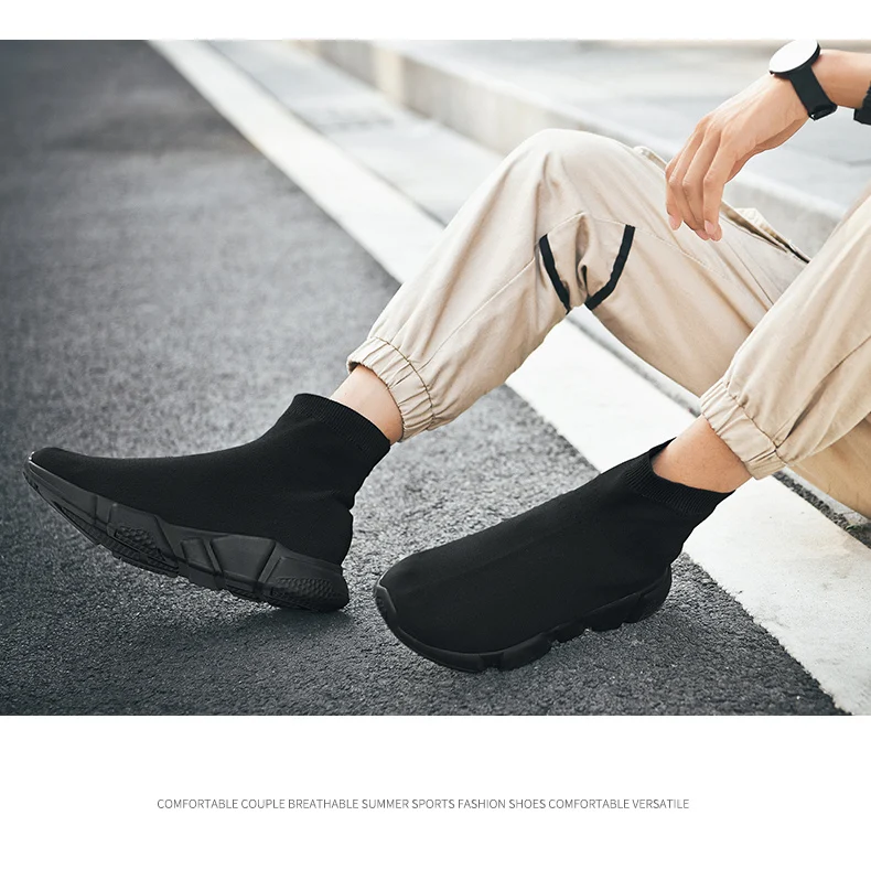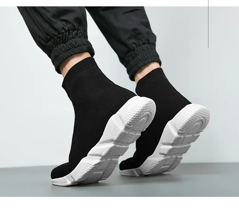 These fashionable black sneakers for men are lightweight and designed with a sock-like fit, making them comfortable for running and everyday wear. The sneakers are stylish and versatile, für verschiedene Gelegenheiten geeignet. They provide excellent support and cushioning for the feet, making them ideal for long hours of wear. The sneakers feature a modern design that will keep you looking on-trend while providing functionality for your active lifestyle. Whether you are hitting the gym or running errands, these sneakers are a great choice for a comfortable and fashionable footwear option.