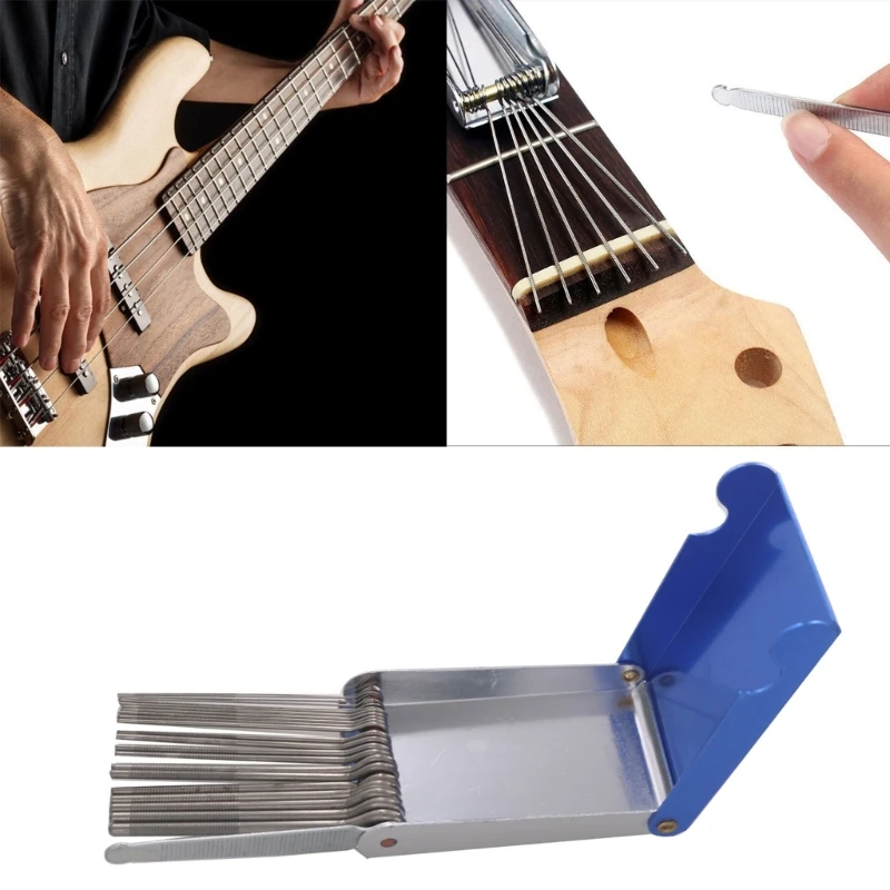 tragbar & Komfortabel: Die Gitarren- und Bass-Bridge-File-Kits sind mit einer Aufbewahrungsbox ausgestattet, die leicht und praktisch sind, und sind schnell zu verwenden und aufzubewahren. Es ist ein praktisches Gitarrenreparaturwerkzeug und kann beruhigt verwendet werden.