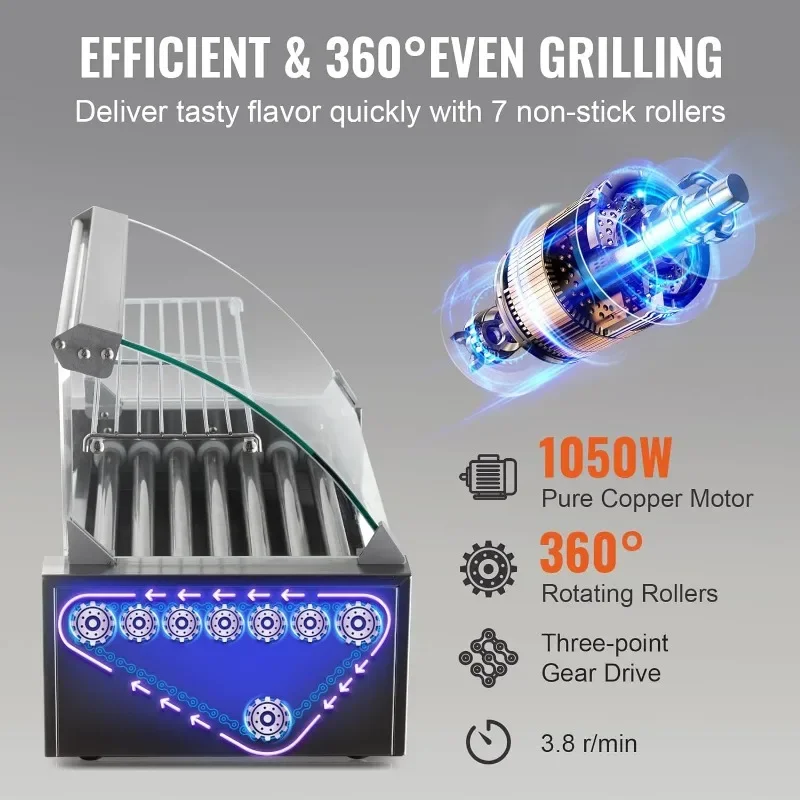 - 360-Grad des Geschmacks: Aufgrund der Dreipunktkettenkonstruktion, Die Walzen dieser Hot-Dog-Maschine können um 360° gedreht werden, um das Essen gleichmäßig zu garen. Außerdem, Der leistungsstarke 1050-W-Motor sorgt für hocheffizientes Kochen, sodass Sie Hot Dogs im Inneren genießen können 15 Protokoll. Sie sind im Handumdrehen bereit für die Vorbereitung der zweiten Runde.