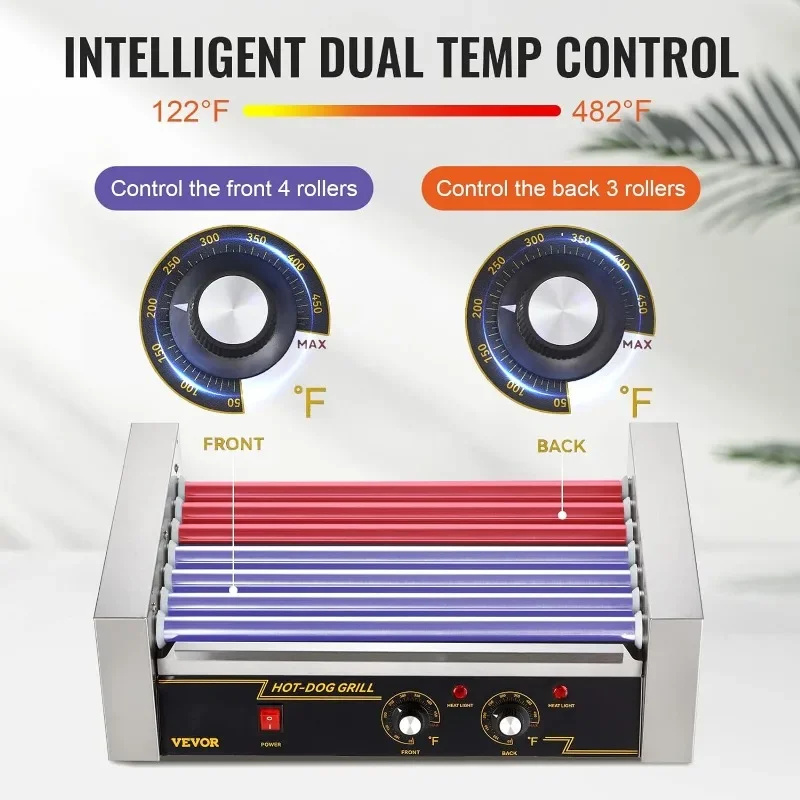 - Dual-Temperatur-Zifferblätter: Mit zwei Drehknöpfen lässt sich die Kochtemperatur für Vorder- und Hinterwalze mühelos auf bis zu 200 °C einstellen. Der linke Knopf steuert die Vorderseite 4 Rollen, und der rechte Knopf steuert die Rückseite 3 Rollen. In diesem Fall, Dadurch können die hinteren Rollen kontinuierlich garen, während die vorderen Rollen das Essen heiß und servierbereit halten.