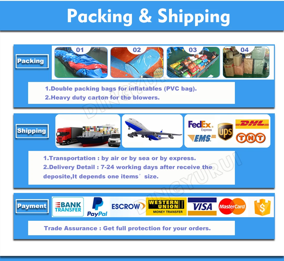 — Wir werden Doppelverpackungsbeutel für unser aufblasbares Produkt verwenden: PVC -Tasche + Extra gewebter Tasche für Schifffahrt und Hochleistungskarton für die Gebläse.