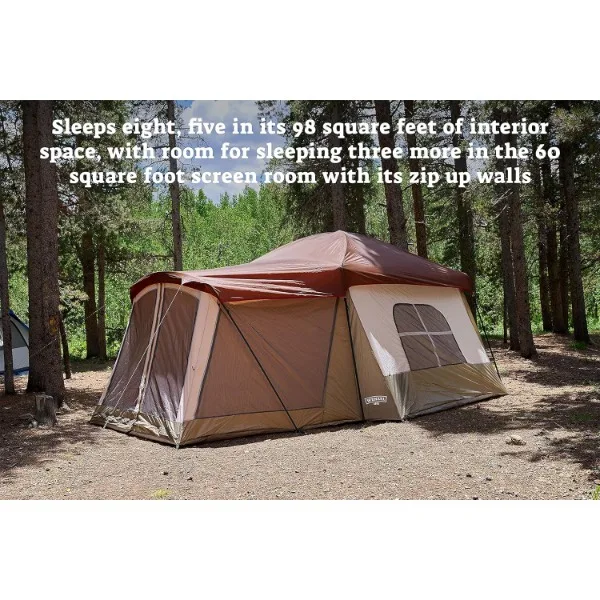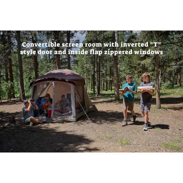- Convertible screen room with inverted „T“ style door and inside flap zippered windows