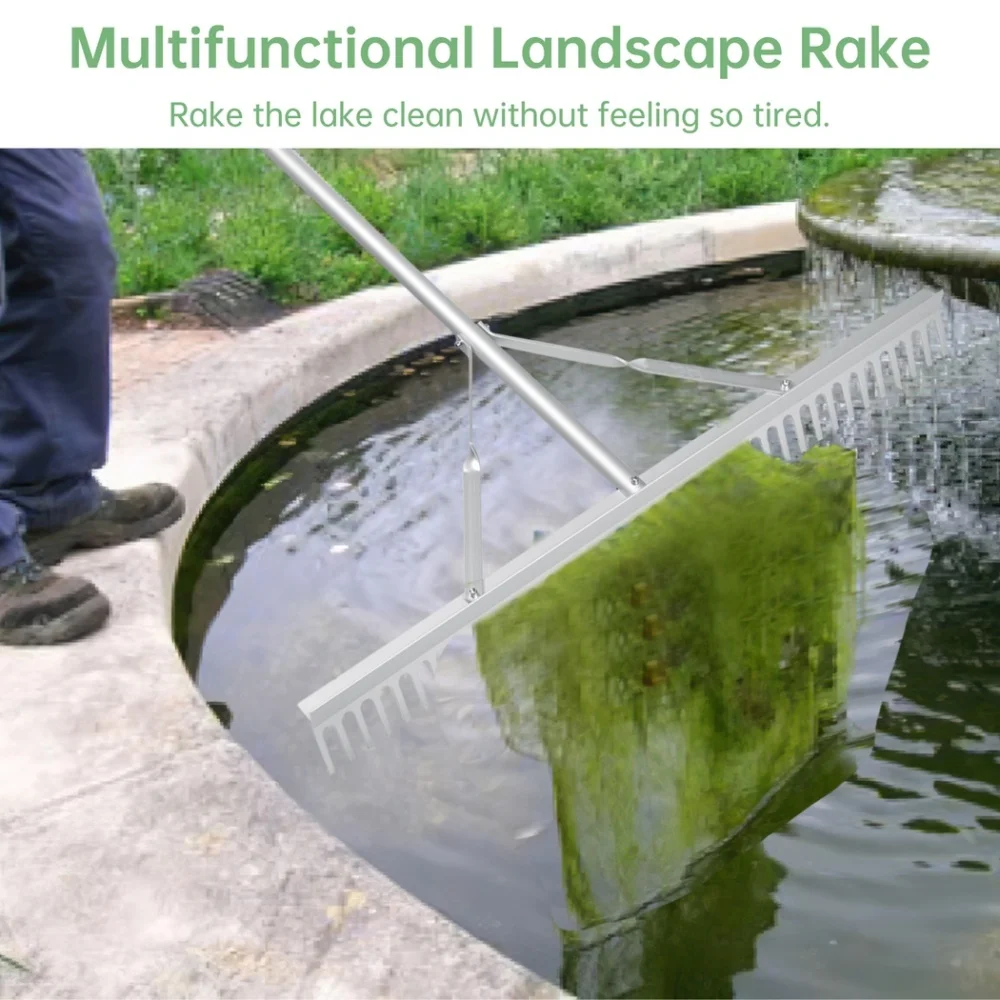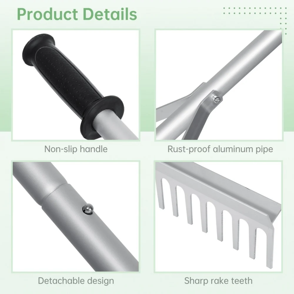 Its detachable handle allows for easy storage and transport, making it compact and space-saving when not in use. Perfect for various outdoor projects, this versatile rake is suitable for leveling soil, removing debris, spreading gravel, grooming lawns, or cleaning ponds. It is ideal for homeowners, gardeners, Landschaftsgestalter, and maintenance crews.