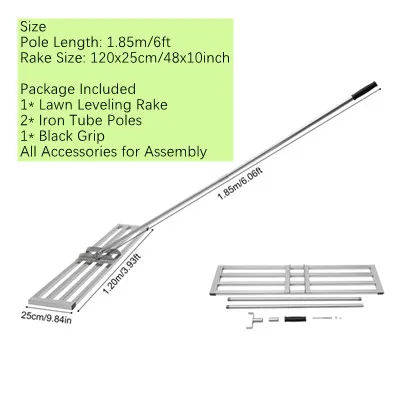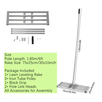 Einstellbare Länge — This lawn leveling rake consists of iron tube poles, Also you can adjust its length by freely combining them for different needs, which both can effectively avoid back pain but also suitable for people of different heights.