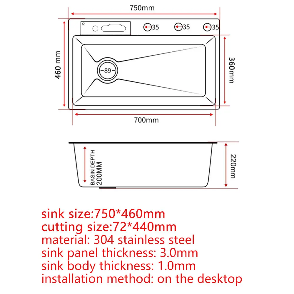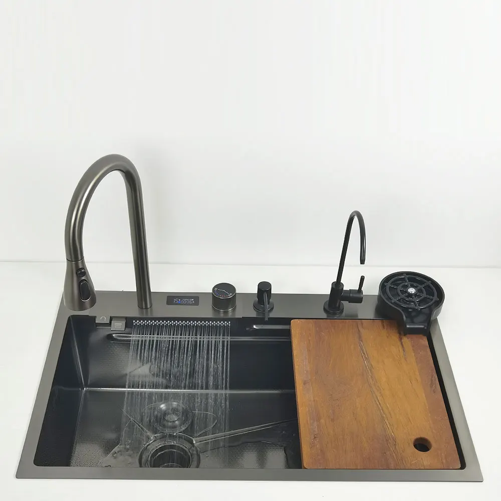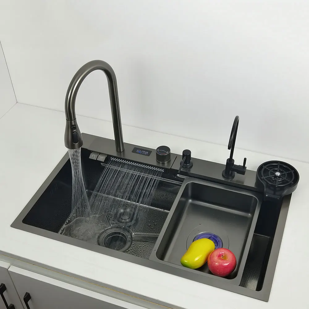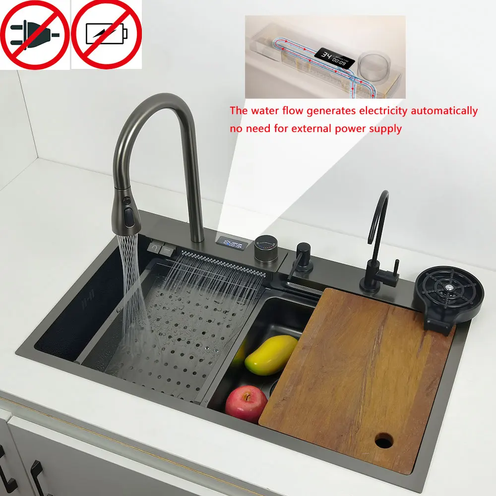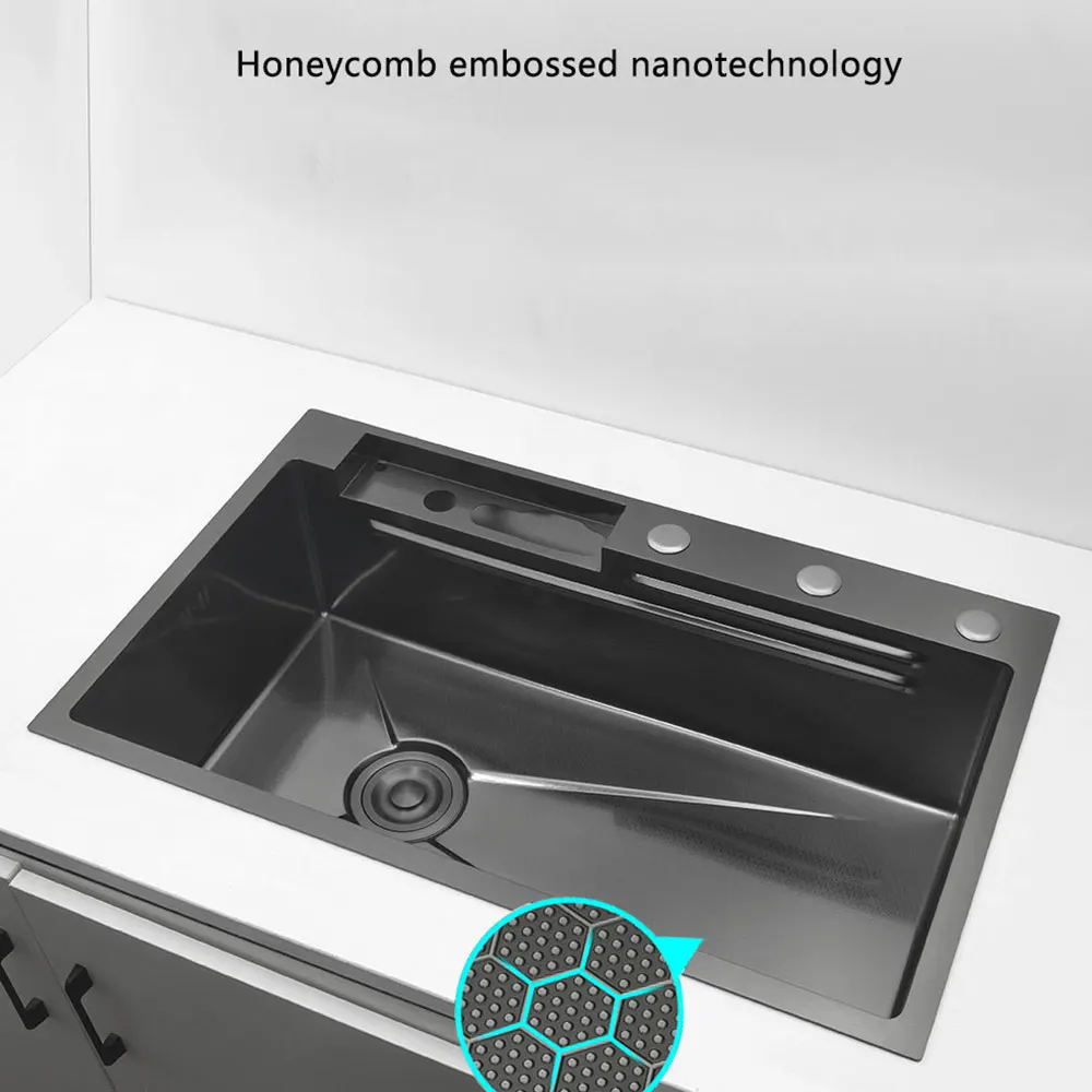 This content describes a LED waterfall faucet for a kitchen sink with a honeycomb design and anti-scratch nano technology. The sink has a left drain and is made of high quality 304 Edelstahl. It features a large single basin design.
