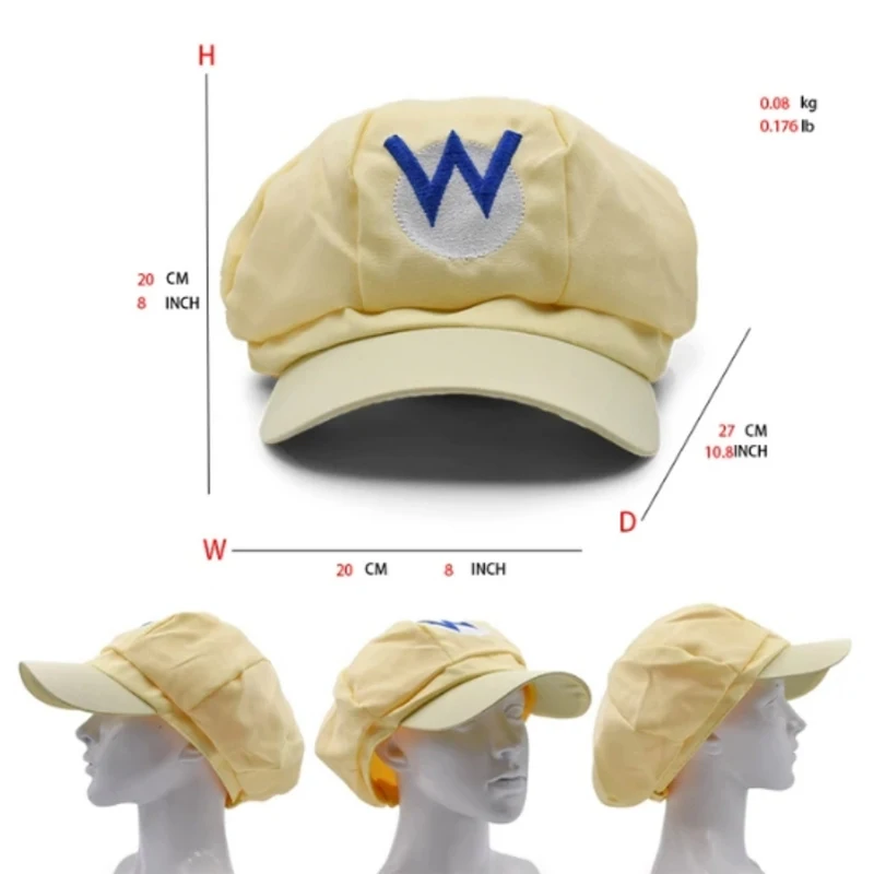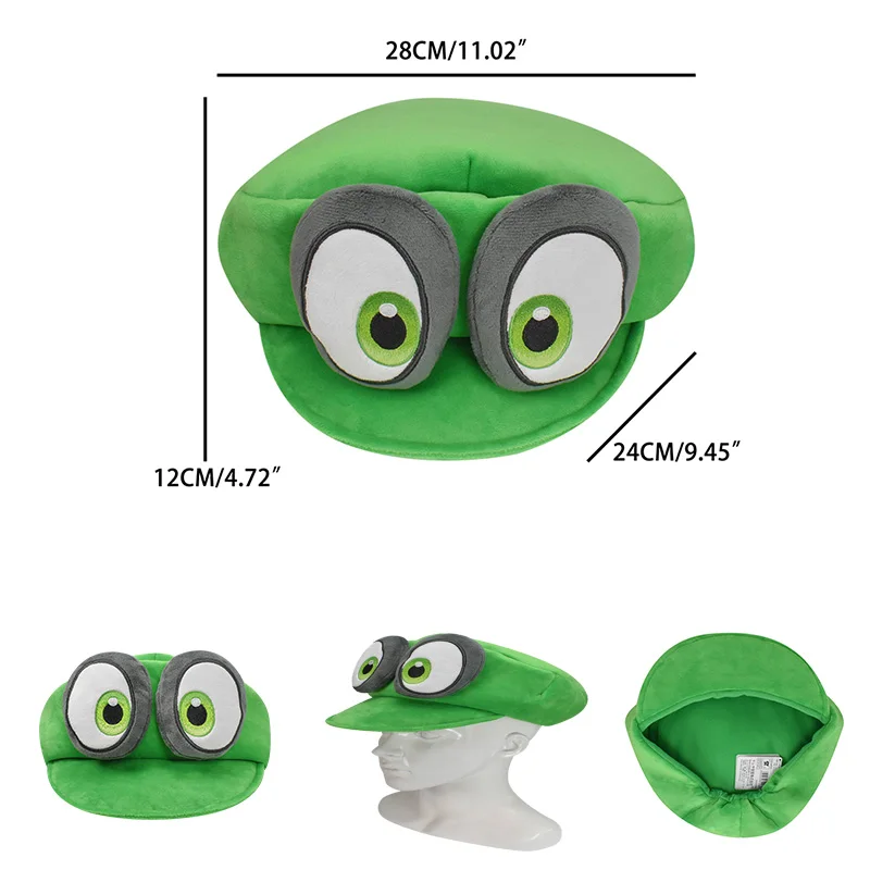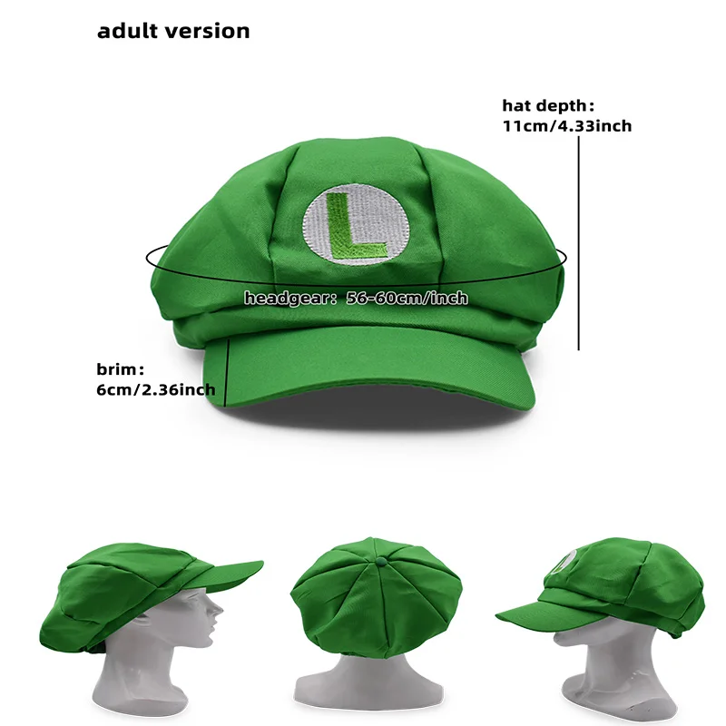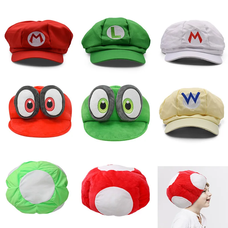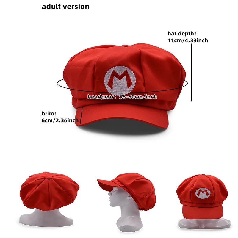 This content describes three hats inspired by the popular video game series Mario Bros. The hats include a crown similar to the one worn by Princess Peach, a mushroom hat, and a baseball cap with English letters embroidered on it. The hats are designed for cosplay and feature green and red color schemes.
