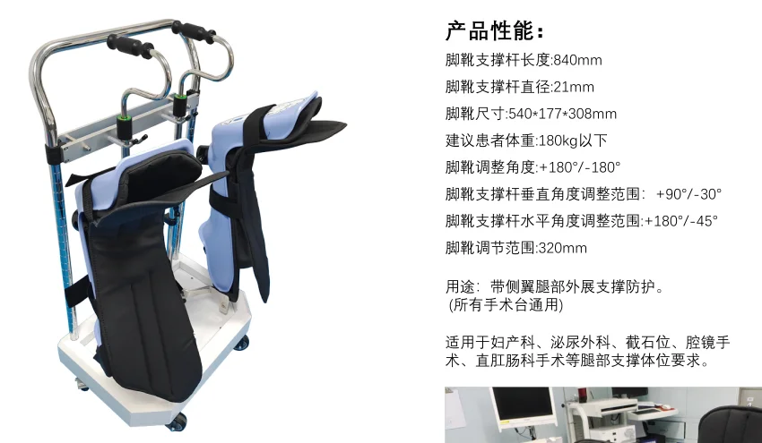 用于患者保暖或排汗。独特的靴子式腿托设计能避免腘窝受压,腿部压力有效分散至脚掌及臀部,当移动腿架时,腿托能自动