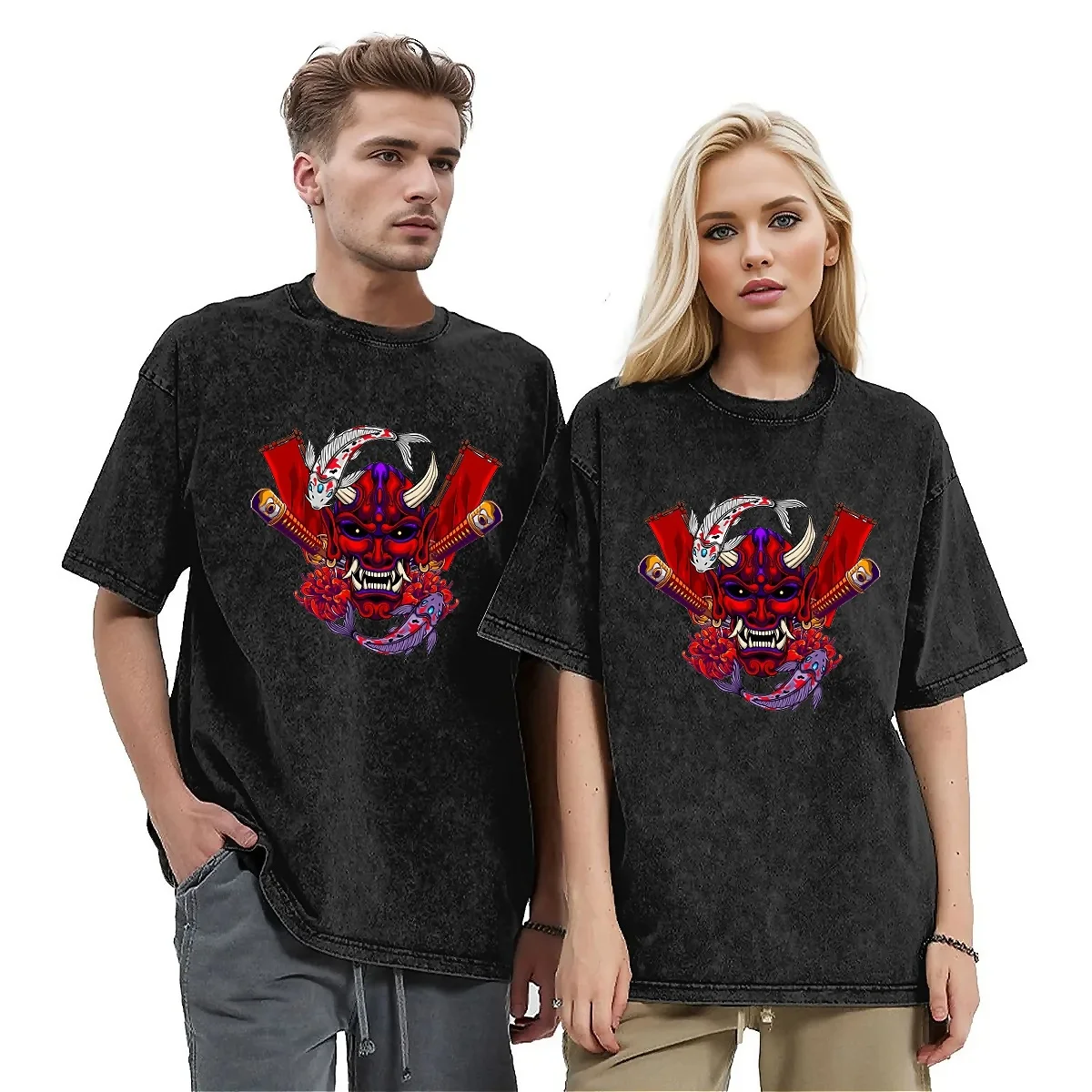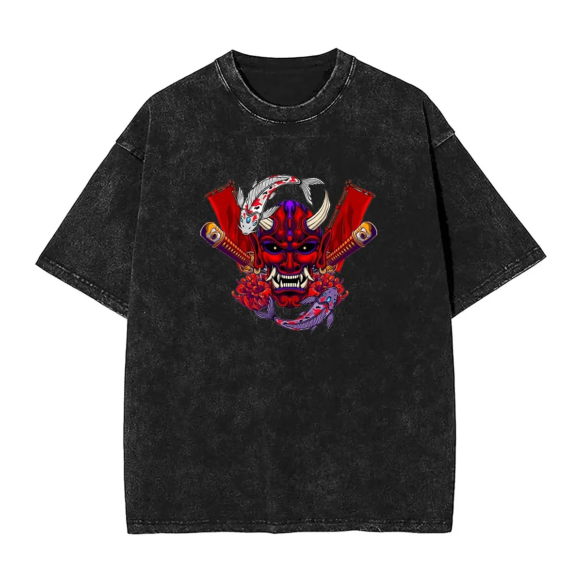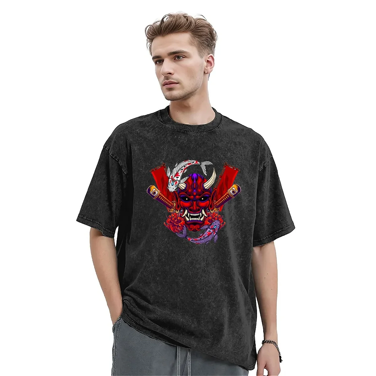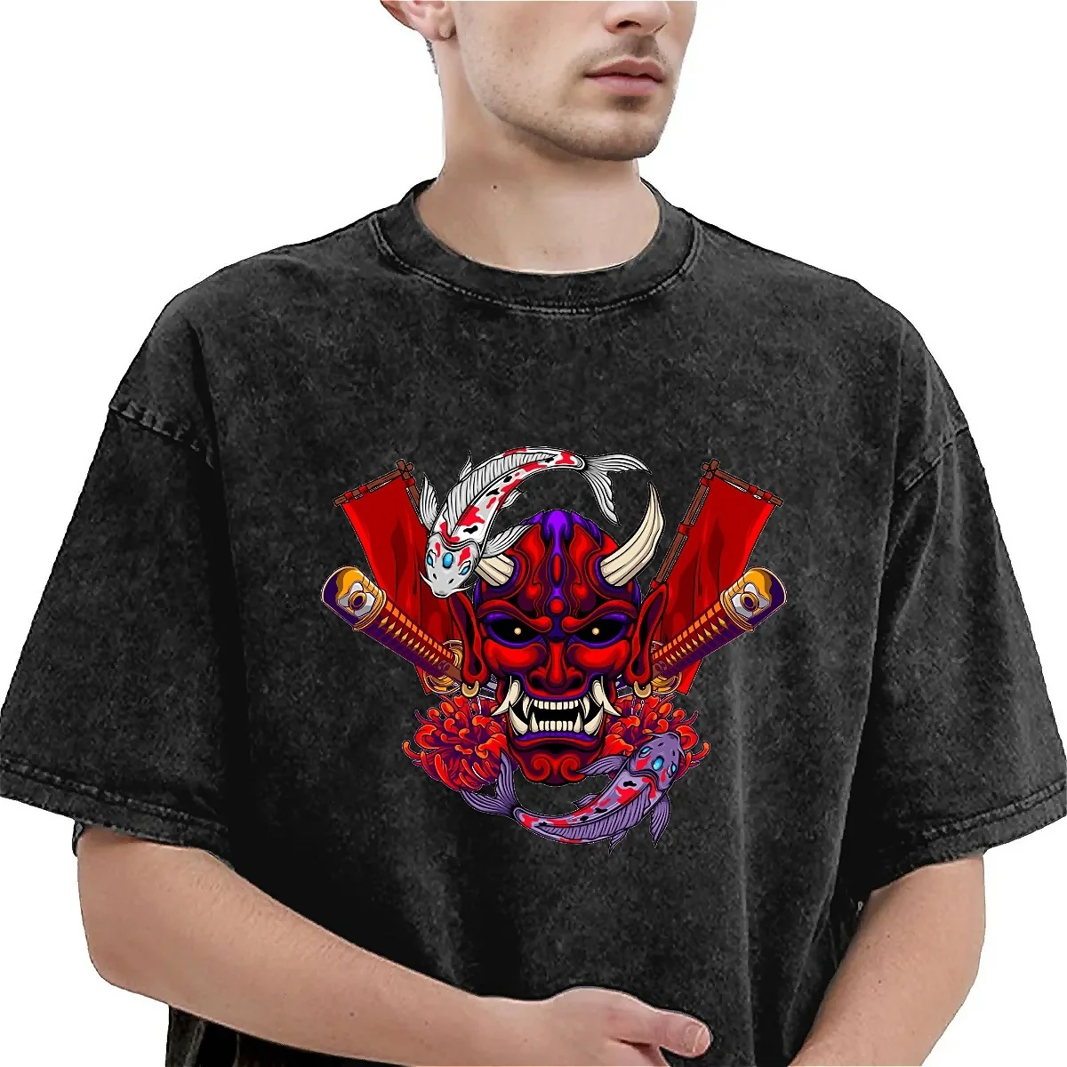 This content describes an oversized washed T-shirt featuring a kabuki mask design, Koi fish, and a kawaii theme for men in a Y2K basic design style, perfect for summer. The shirt is loose-fitting and comfortable, making it a trendy and casual choice for daily wear. It combines traditional Japanese elements with a modern aesthetic, creating a unique and stylish look. The T-shirt is part of a line of basic clothing items that are perfect for creating versatile and stylish outfits.