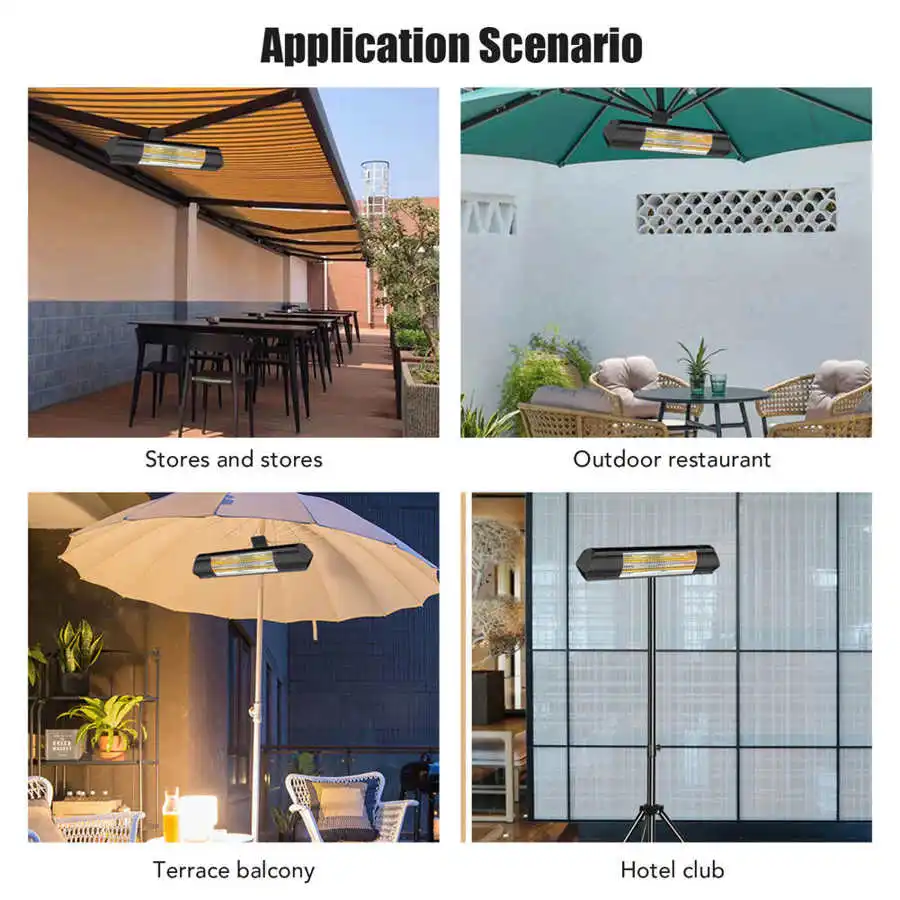 5. Wand montiert: The electric patio heater can be mounted on th wall or ceiling, just use the screws and nails to fix the heater. With remote control, very convenient to use.