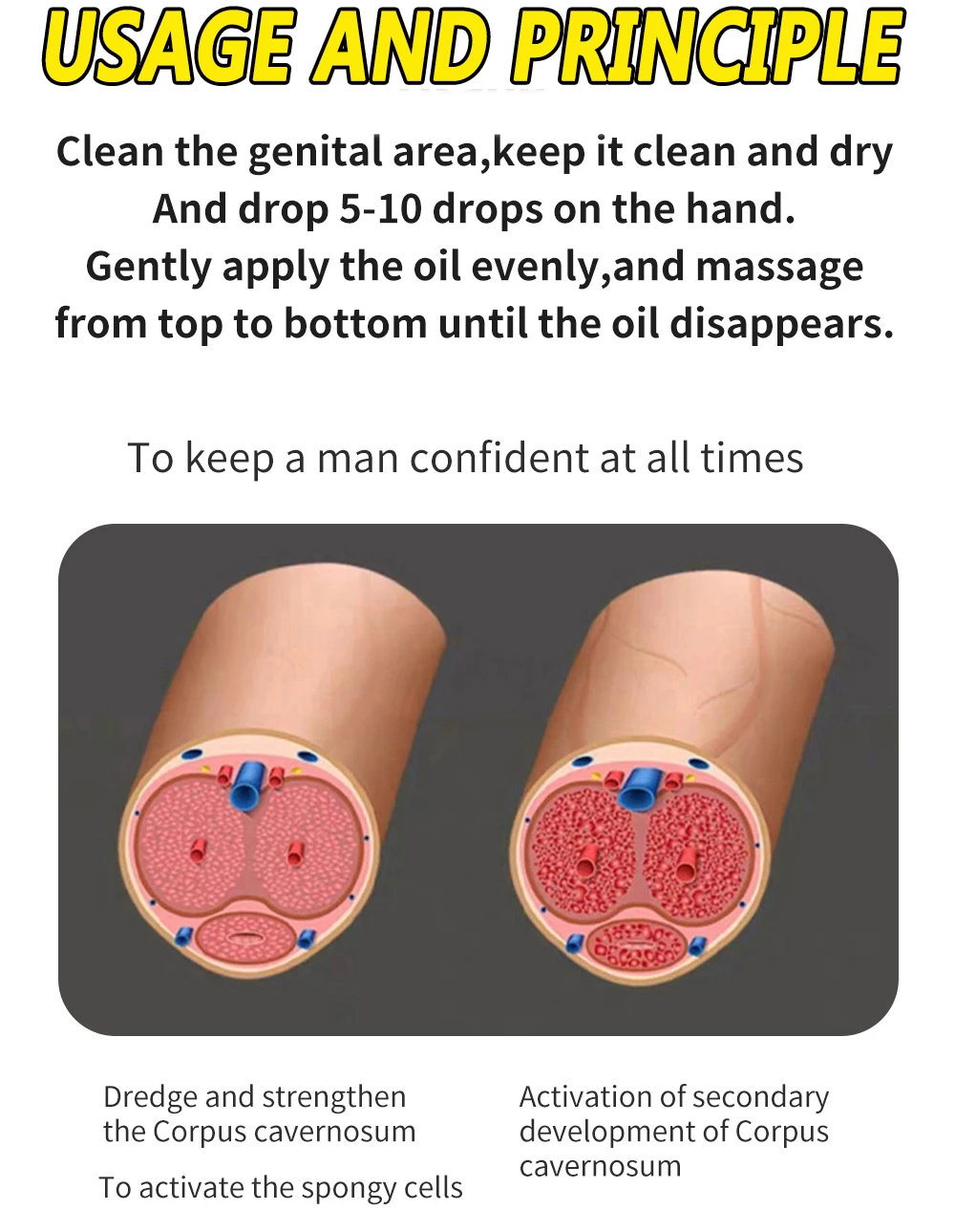 1. Dieses Produkt ist ein ätherisches Ölöl aus natürlichen Pflanzenextrakten und konzentrierter wissenschaftlicher Formel. Die nano-molekulare Technologie kann in die Zellwand eindringen und die schwammigen Zellen aktivieren, um wieder zu wachsen, den Penis dicker machen, länger und stärker