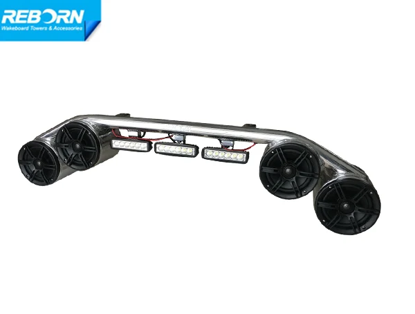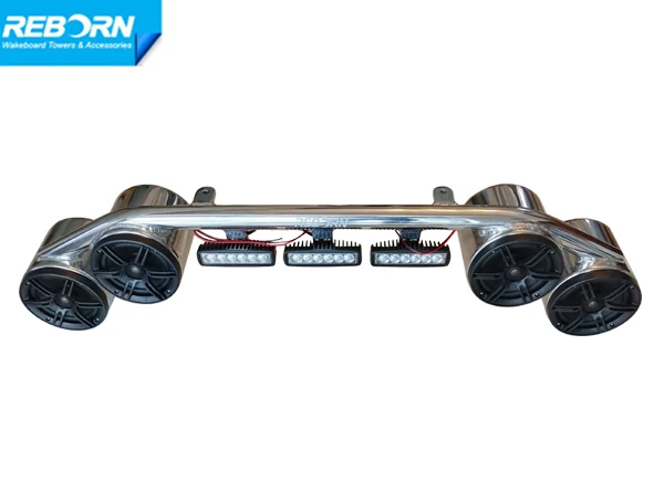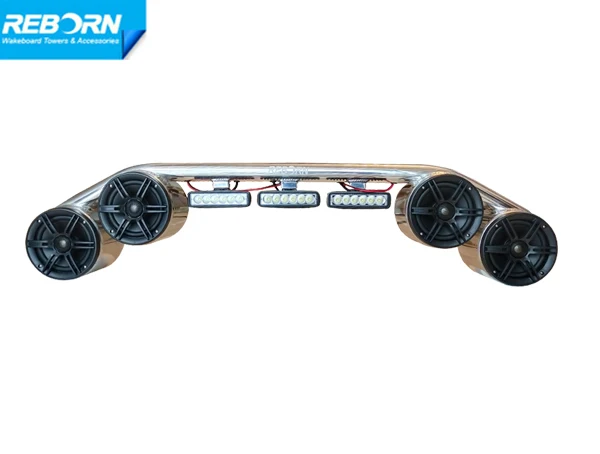 Reborn wakeboard tower speaker and light bar combo is manufactured with polished 6061 aluminum and is pre wired fro easy installation. We have installed 4 high quality water proof speakers, Und 3 X 18 watt LED lights.