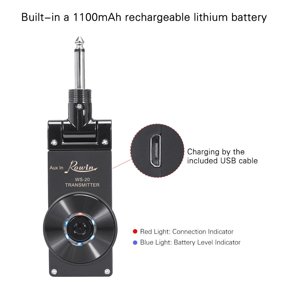 Einführung des Rowin WS-20-Wireless-Gitarrensystems, Die ultimative Lösung für problemlose Leistungen und Praktiken. Mit diesem hochmodernen drahtlosen System können Sie mit Leichtigkeit kristallklares digitales Audio übertragen und empfangen.