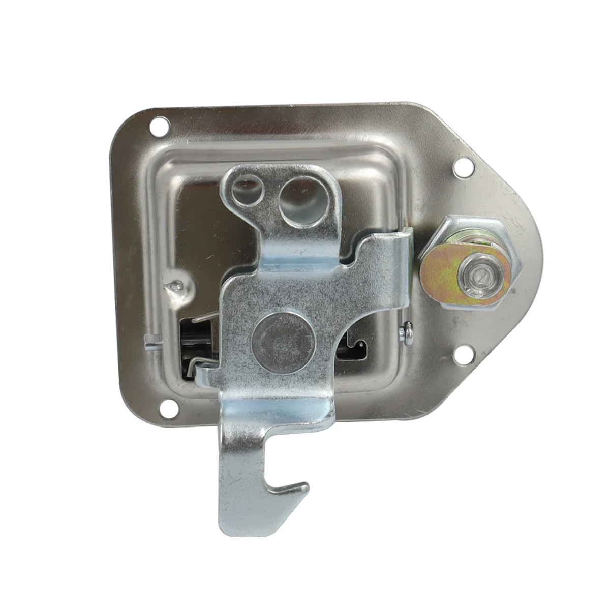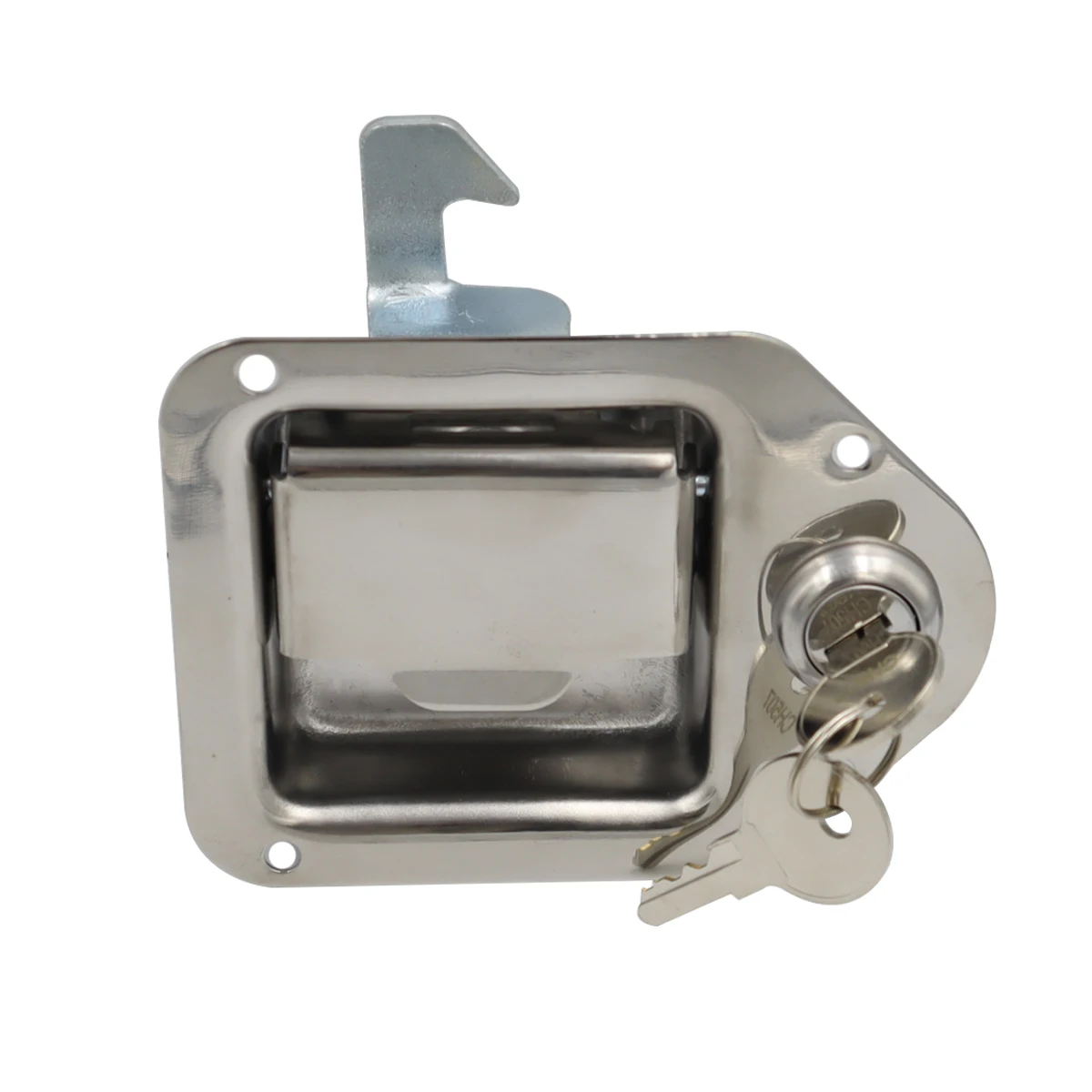This content describes a standard flush stainless steel paddle handle locking latch for an RV truck door tool box. The heavy-duty lock is designed to mount securely onto the box, providing a durable and secure solution for storing tools and equipment. The stainless steel construction ensures durability and resistance to corrosion. This locking latch is designed to provide added security for the contents of the tool box while also being easy to operate.