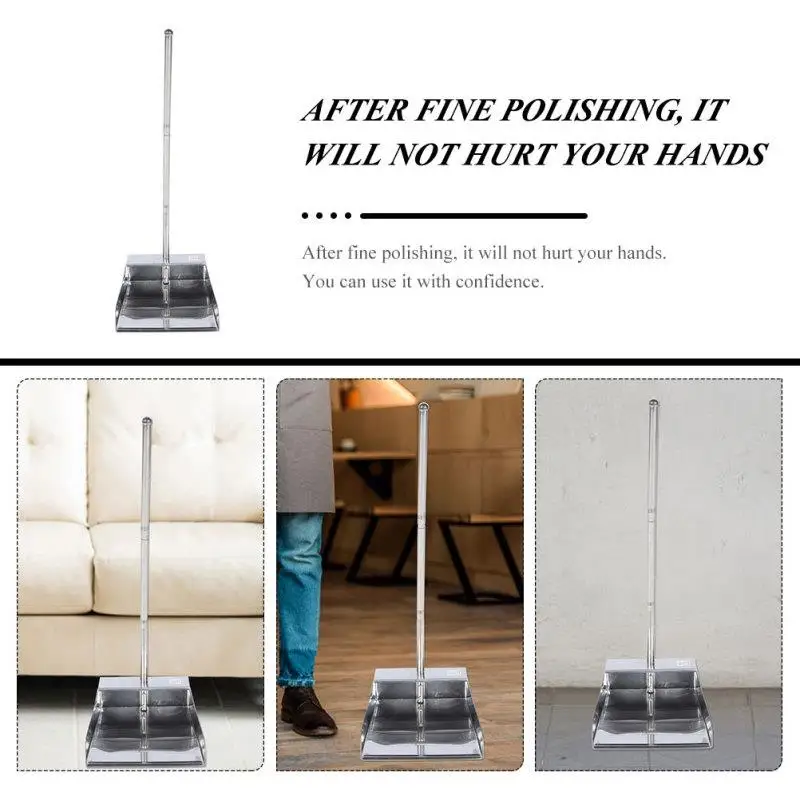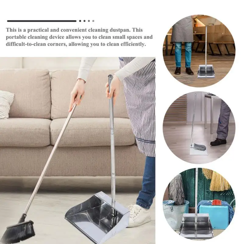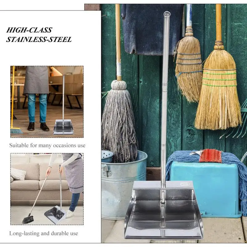 This content describes a heavy-duty, stainless steel dustpan with a long handle that is ideal for cleaning large amounts of trash in office or home settings. The dustpan is designed to handle heavy loads and provide efficient cleaning capabilities. Its durable construction makes it suitable for various cleaning tasks, while the long handle allows for easy handling and improved reach. This cleaning tool is a practical and effective solution for keeping spaces clean and tidy.