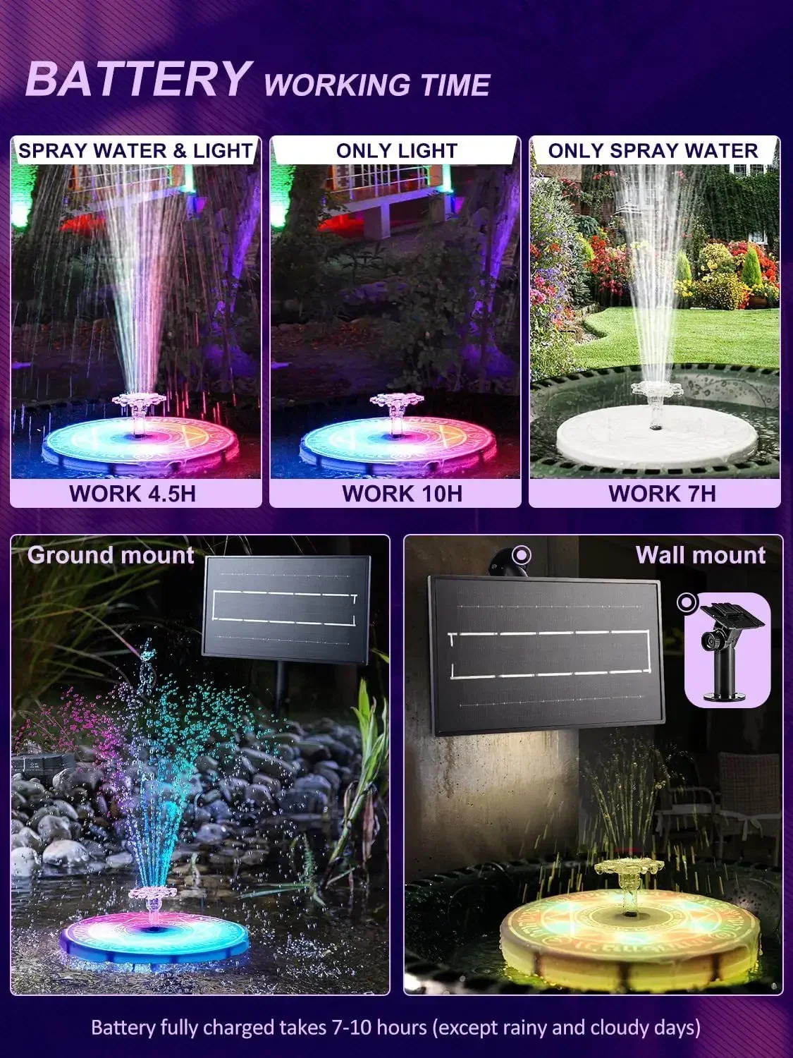 When the sunlight irradiate the solar panel at daytime, the excess energy will be stored in the battery, ensure the flow of fountains and wonderful lights continue to work at night. Maximum power working time is 4.5h, einzelnes Licht 10 H, single water pump 7h.