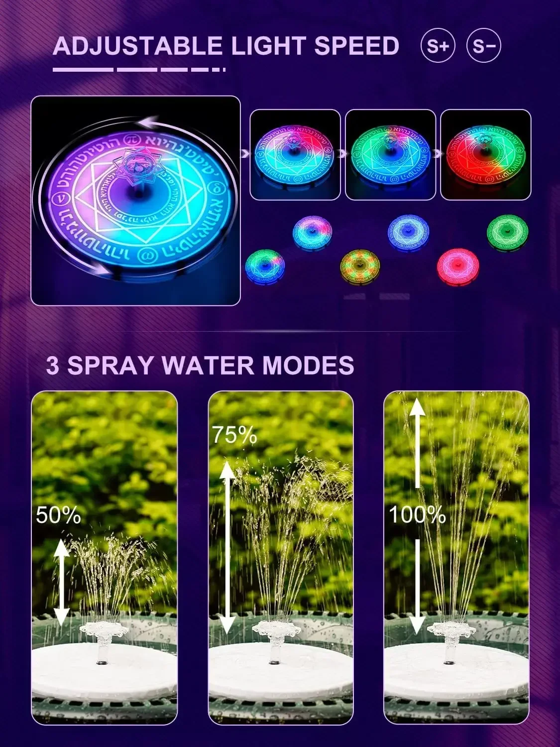 Not only the fountain, the light panel support variety of color patterns, can be a decorative light to your garden pool. Natürlich, also you can turn on together with the fountain and glowing panel, to produce multiple colors and effects, to add more fun and scenery to your garden.