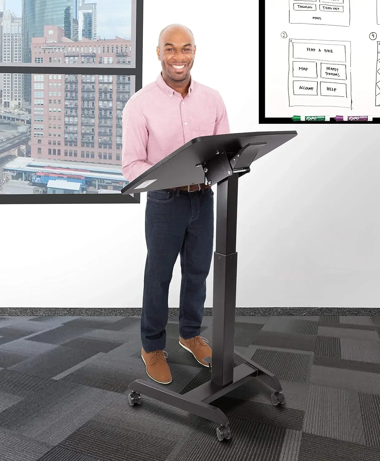 The Stand Steady Multifunctional Mobile Podium Desk is a portable sit to stand lectern with pneumatic height adjustment and tilting desktop. This podium desk allows users to easily switch between sitting and standing positions, promoting a healthier work environment. The pneumatic height adjustment feature makes it simple to raise or lower the desk to the desired level. The tilting desktop allows for ergonomic positioning of laptops or tablets. Gesamt, this mobile podium desk is versatile, einfach zu bedienen, and provides a comfortable workspace for various needs.