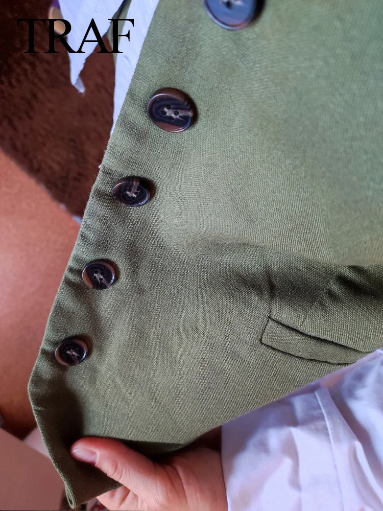 The TRAF 2024 Women’s Clothing Shorts Set includes a solid brown sleeveless cardigan vest paired with casual loose shorts, creating a fashionable two-piece set perfect for beach holidays. The set is designed for women and offers comfort and style. The sleeveless cardigan vest adds a chic touch, while the loose shorts provide a relaxed fit for warm weather. This versatile outfit can be easily dressed up or down for different occasions.