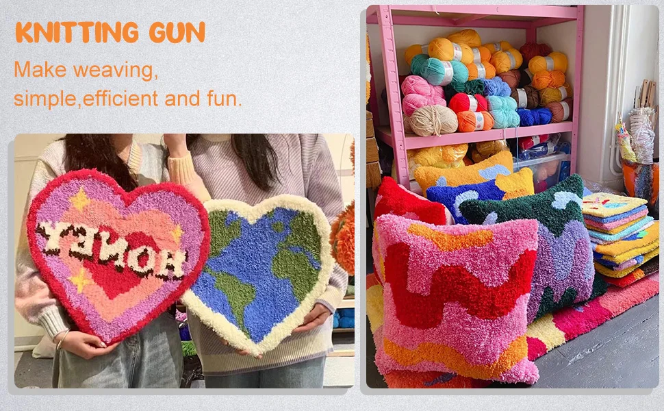 The Tufting Gun is a 2 In 1 rug gun that can create cut pile and loop pile rugs. This electric carpet rug maker machine is designed for beginners and features adjustable speed settings. It allows users to easily create their own custom rugs with different textures and designs. The Tufting Gun is a versatile tool that offers a quick and efficient way to create unique and personalized rugs for home decor or commercial use. This machine is easy to use and is perfect for those looking to get started in rug making.
