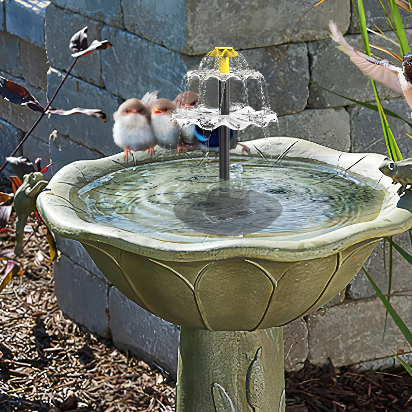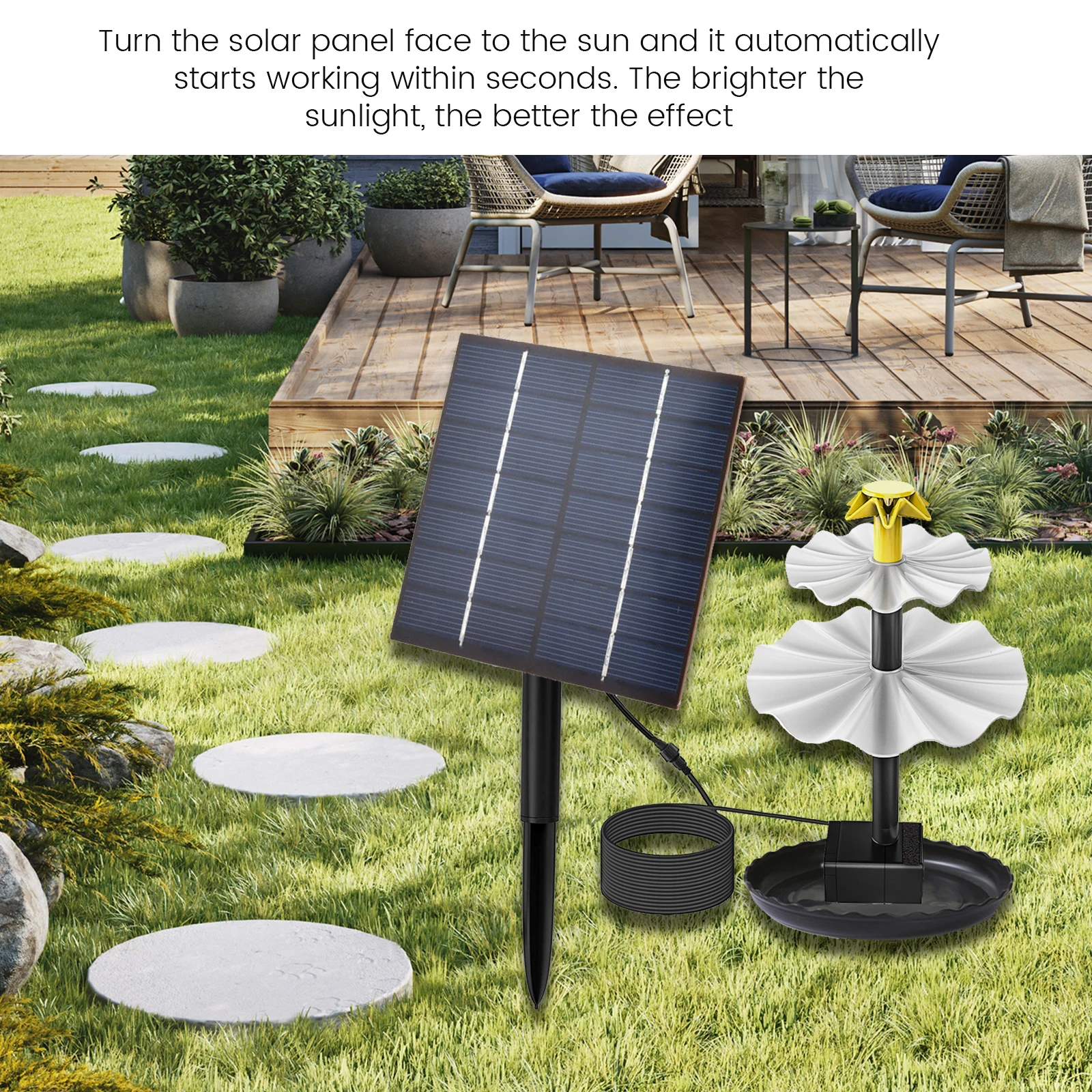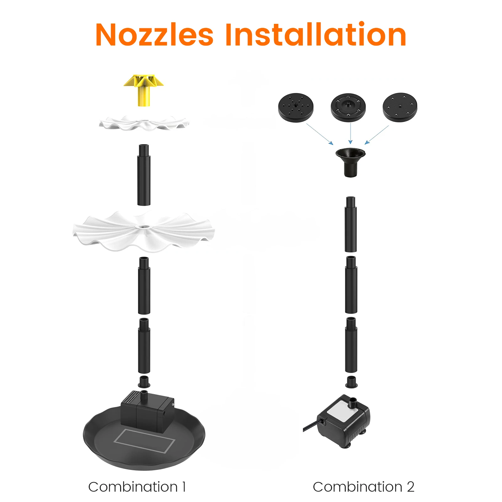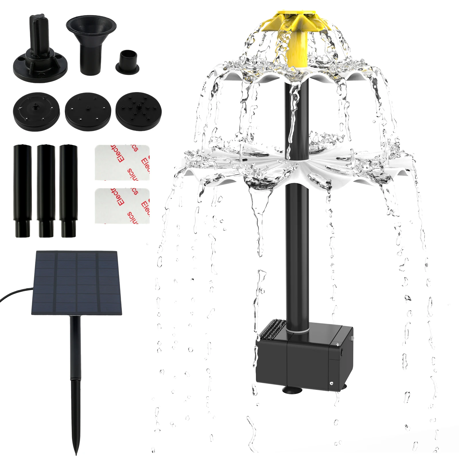 [6 Different Water Styles] This solar fountain comes with 6 Diferentes boquillas, you can easily change the nozzle shape to prevent water from splashing around. It can be attached to a hose to create different water features to suit your good ideas. This is a multifunctional solar water pump, perfect for bird baths, peces, estanques pequeños, y jardines. [Fácil de usar] This solar fountain pump is easy to use, you can make a fountain or water feature and then face the solar panel towards the sun, once the solar panel gets sunlight, it will automatically start working in seconds. The brighter the sunlight, the better the effect. The wire between the solar panel and the pump is long enough (7.6 pie) to cover a relatively wide area without having to worry about the pump not working in the shade. [Environmentally Friendly and Safe] This solar water fountain does not require batteries or electricity and is completely controlled by solar energy. Por lo tanto, it is very environmentally friendly. It is very safe for users without any danger. It is a perfect yard and garden decoration. [DIY Solar Water Pump Kit] DIY Solar Water Pump Kit with Solar Fountain Kit can be made into a bird bath fountain and a fish tank water circulation tool to help birds and fish maintain a vibrant ecosystem. Replace the nozzle with a hose to create different water features to make your garden look cozy and charming.Especificación: