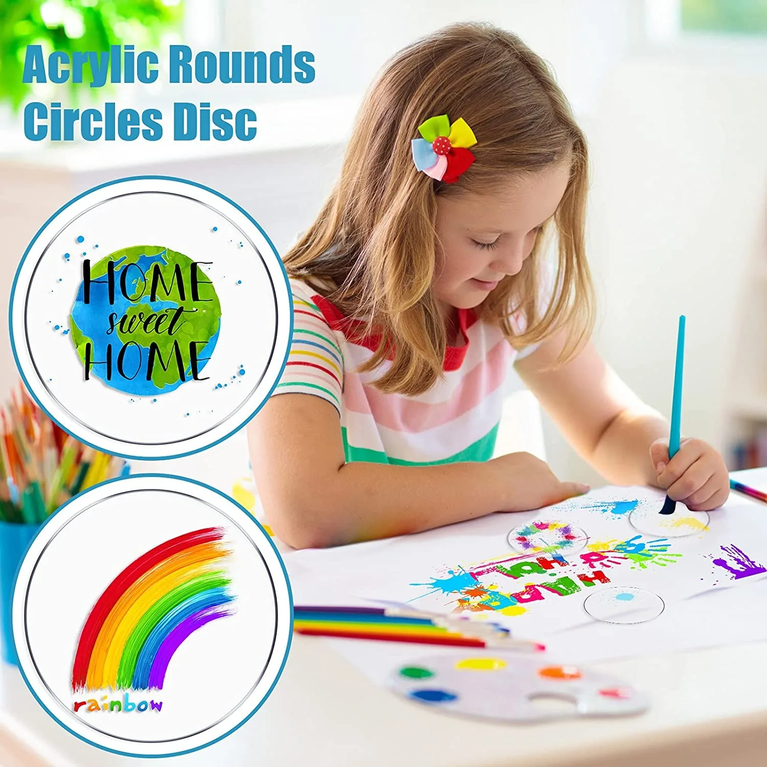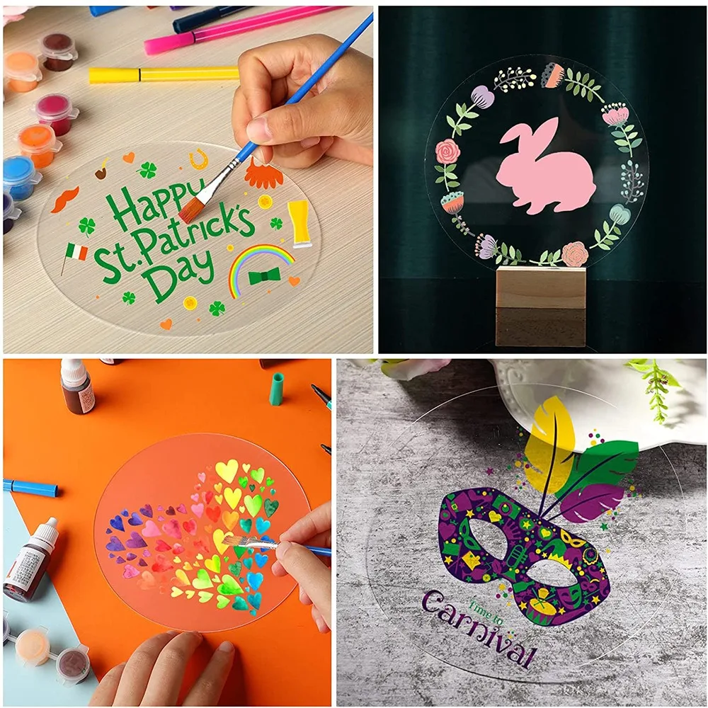 This content is promoting a set of blank acrylic sheets in different shapes (round and square) and quantities (20/40/50 piezas). These sheets can be used for DIY projects such as painting, creating home decor, or making wedding decor boards. The product is described as being made of wood chip acrylic material.