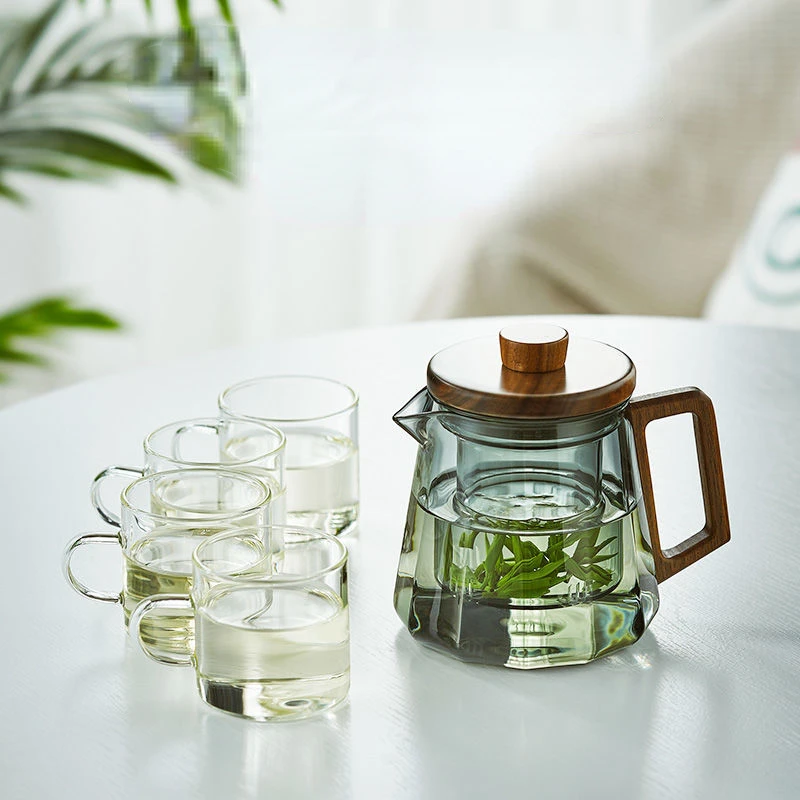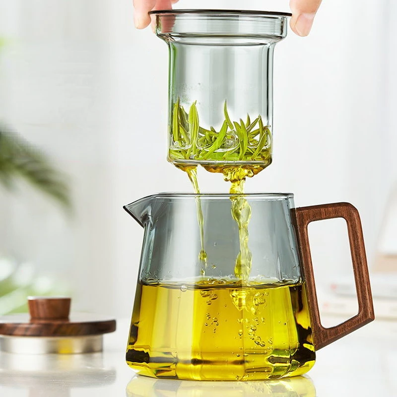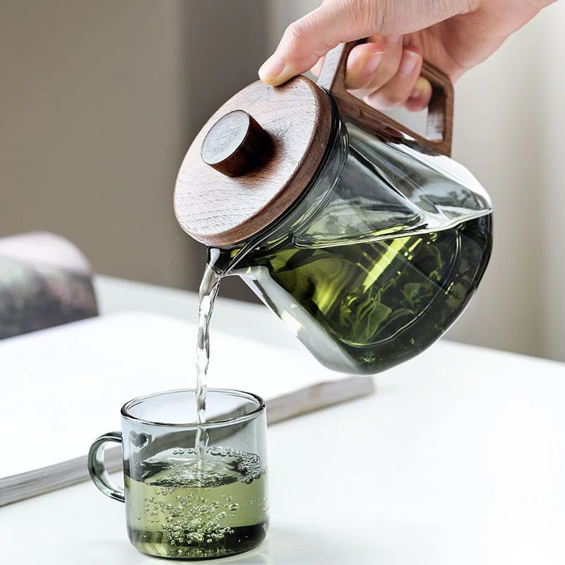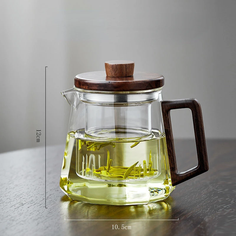 Características: High borosilicate glass material, can be heated by open fire, transparent and textured, black walnut lid, biomimetic spout, smooth water flow, twelve cutting and filtering slots, easy to filter tea leaves