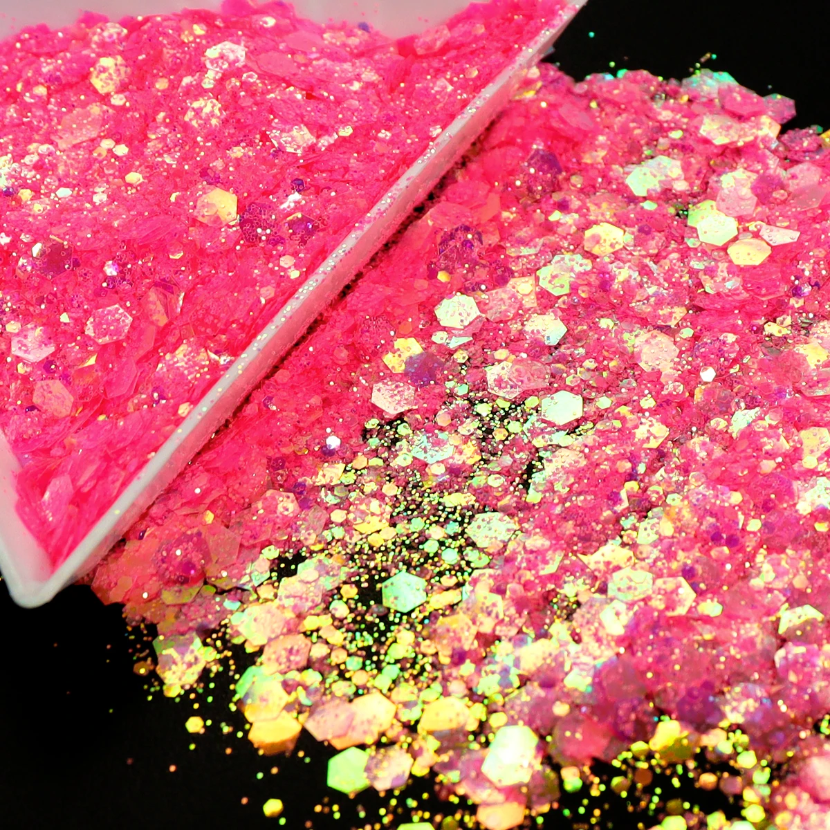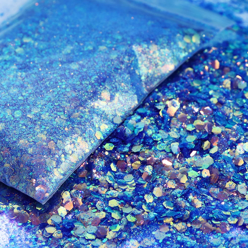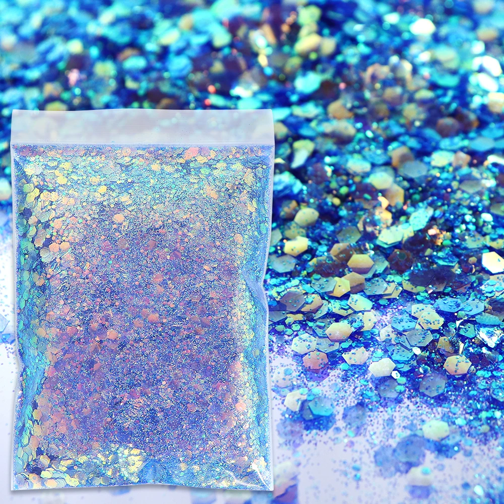 This content describes a 50g pack of Aurora color mixed hexagon shape chunky glitter sequin epoxy resin silicone mold filler used for UV gel craft and jewelry making. The glitter sequins come in a chunky hexagon shape, adding a unique and colorful dimension to resin crafts. The glitter sequins can be mixed into epoxy resin to create jewelry or other craft projects. This product is ideal for those looking to add a touch of sparkle and color to their creations.