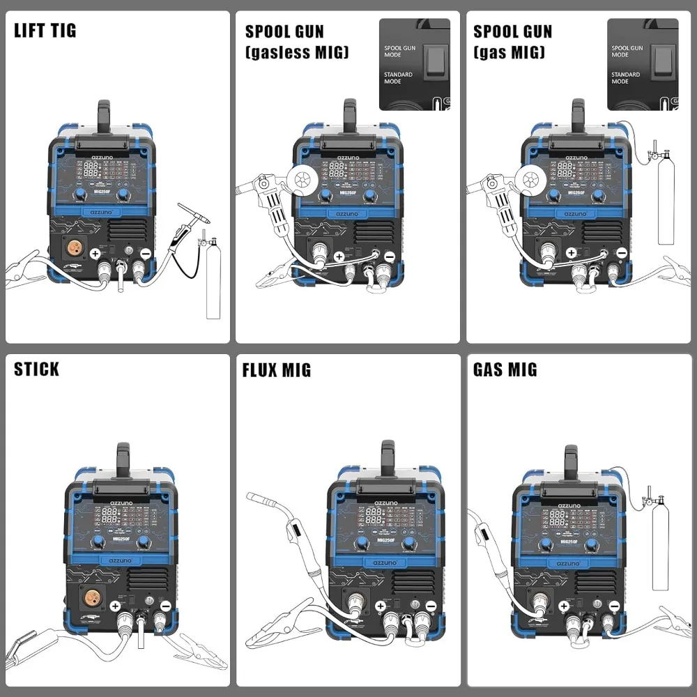 - 6 en 1 Máquina de soldadura:The multifunction welding machine included Gas/Solid Wire MIG, Gasless Flux Core MIG, Stick/MMA, Spot welding, Lift TIG, spool gun comptatible (tig gun and spool gun not included,WP-17V-35,LBT150).
