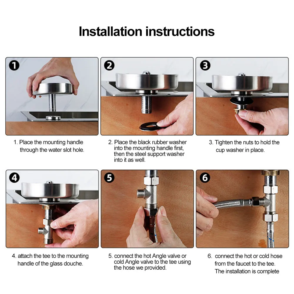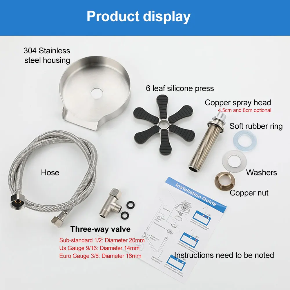 3.[Fácil de instalar y usar] La lavadora del fregadero está equipada con todos los accesorios necesarios para la instalación.. Sigue al usuario'S Instrucciones para una instalación rápida. Después de la instalación, Coloque la boca de la copa hacia abajo, Presione suavemente el fondo de la taza, y rociar automáticamente agua para limpiar. Si se libera la presión, El agua de aerosol se detendrá inmediatamente.