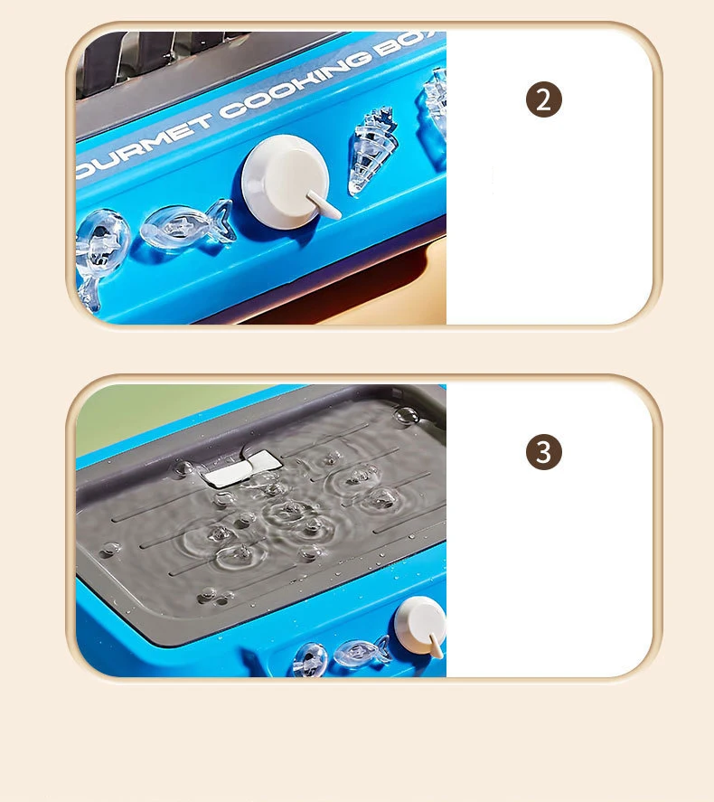 How To Play – To play with this toy, first, put ice and cold water into the cooking box. When you turn on the switch, the water will come out of the hole with a “Gulu-Gulu” sonido. Add the food and seasonings you want to eat, wait for the food to cook (Cambio de color), then plate it up to enjoy your delicious meal. This toy kitchen playset stimulates your child’s creative thinking and helps improve their social skills.