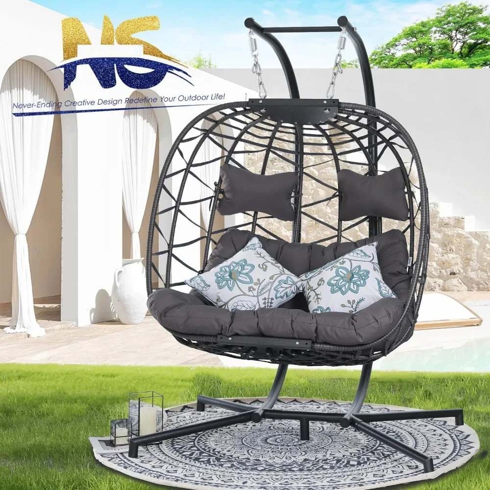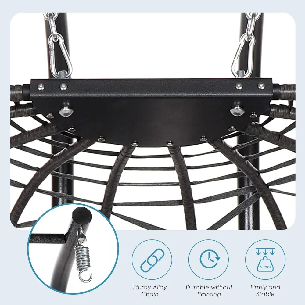 The Double Egg Swing Chair with Stand is an oversized indoor and outdoor hanging chair suitable for two people. The chair features a gray cushion for added comfort and relaxation. This large swing chair provides a unique and stylish seating option for any indoor or outdoor space. The stand allows for easy installation and positioning of the swing chair, providing a cozy and comfortable spot to relax.