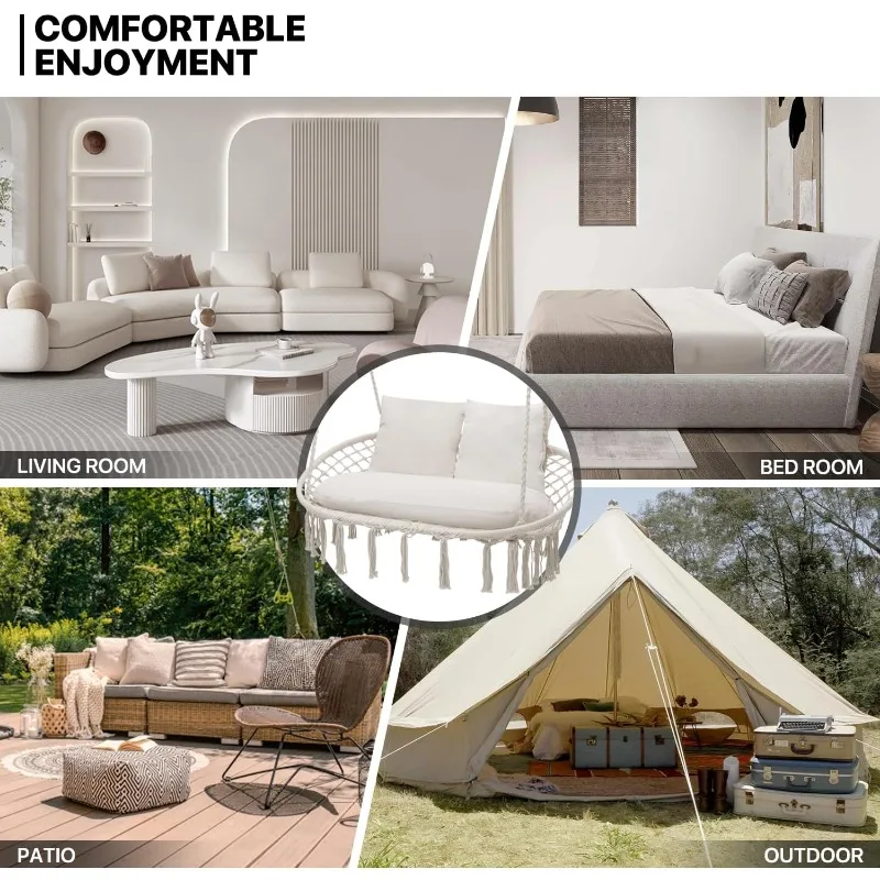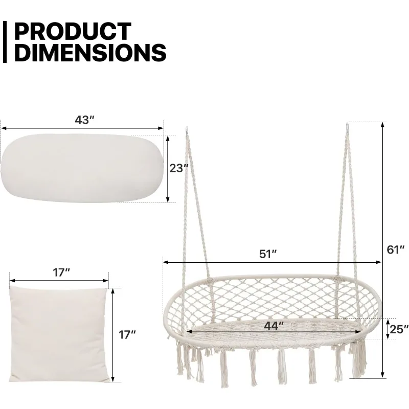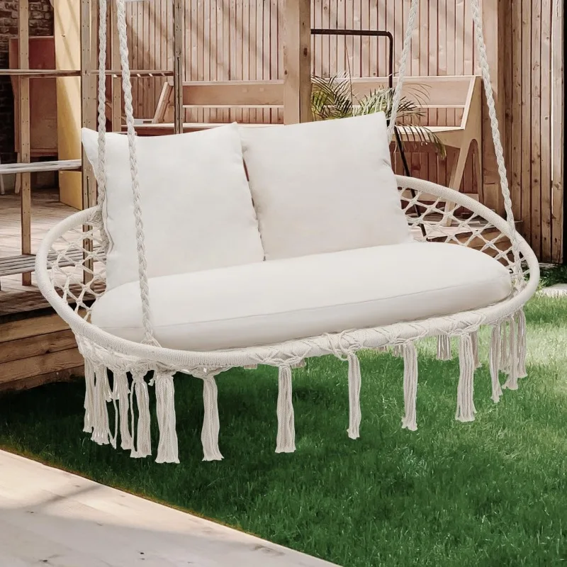 Este columpio doble viene con tres cojines y es adecuado para usar en exteriores o interiores.. El gran columpio colgante de macramé está diseñado para relajarse tanto en interiores como en exteriores.. Proporciona una opción de asiento cómoda y elegante para descansar o leer.. Perfecto para crear un ambiente acogedor y acogedor en cualquier espacio.. La silla es duradera y resistente., haciéndolo una gran adición a cualquier patio, cubierta, o sala de estar. Disfruta de la comodidad y relajación que te proporciona este columpio., mientras agrega un toque de estilo a su decoración interior o exterior.