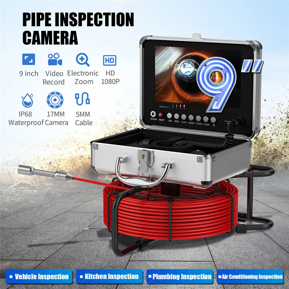 DVR Recording Function 9" Monitor 15M/20M/30M/40M/50M Pipe Inspection Camera IP68 Drain Sewer Pipeline Industrial Endoscope