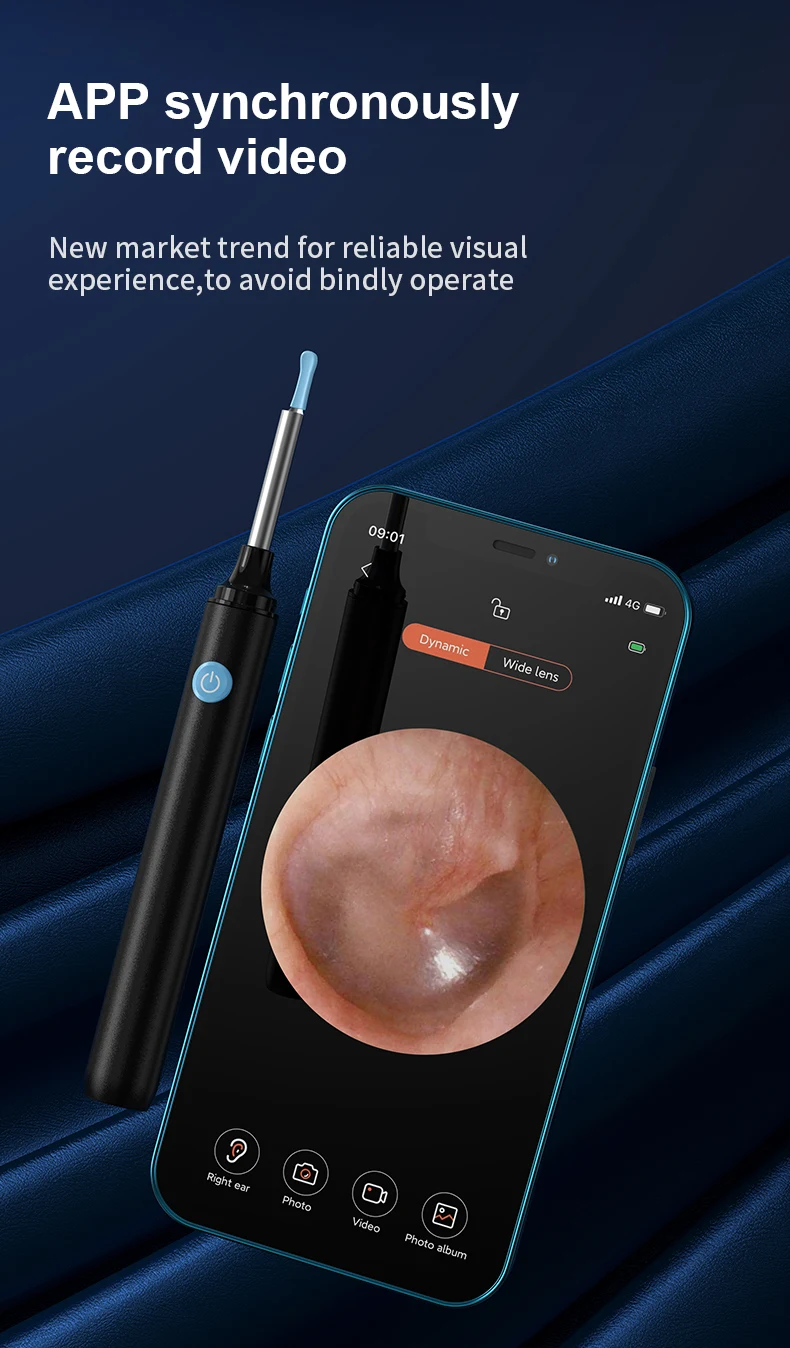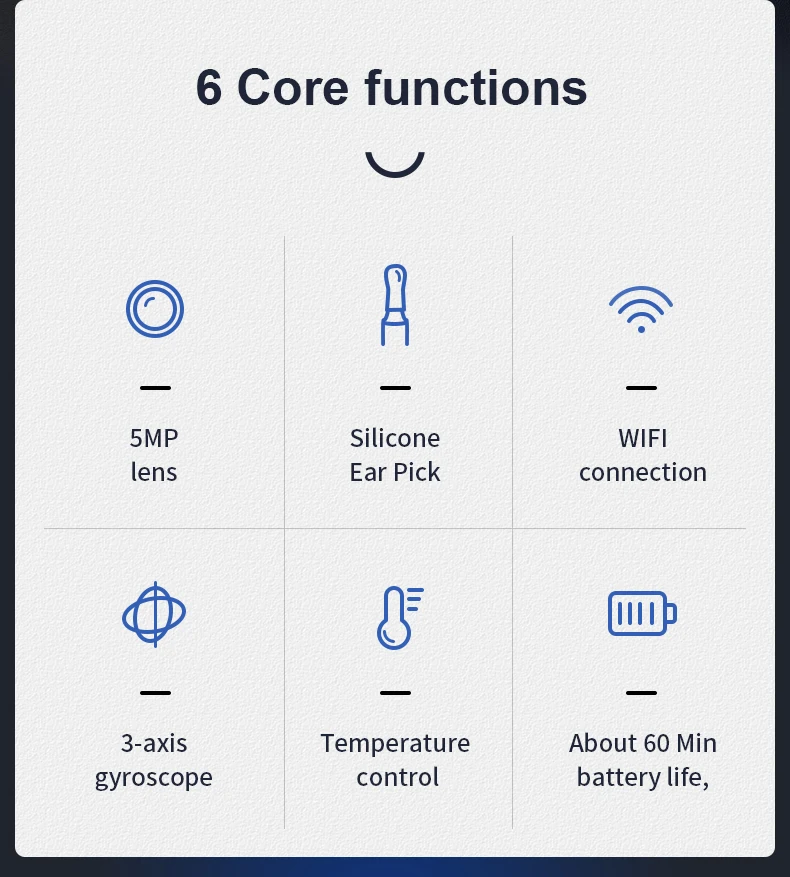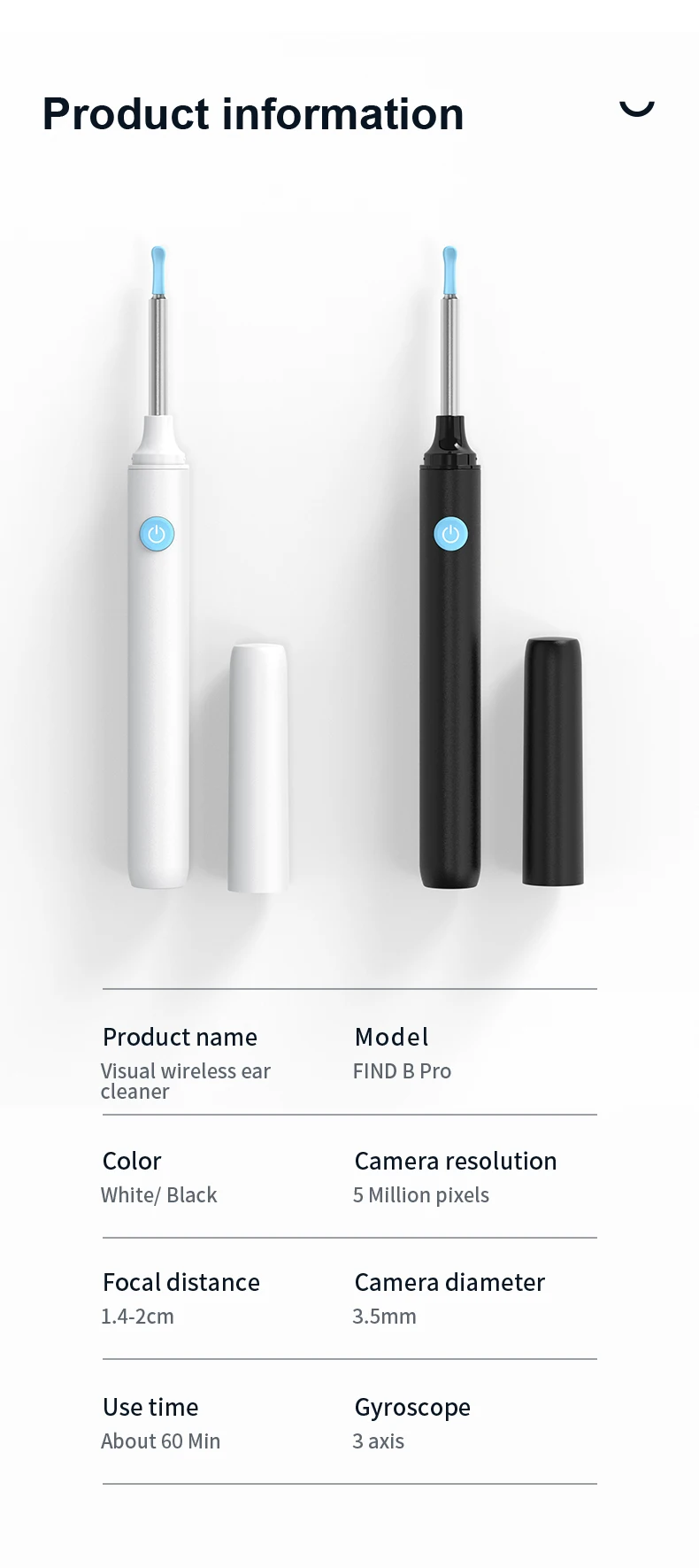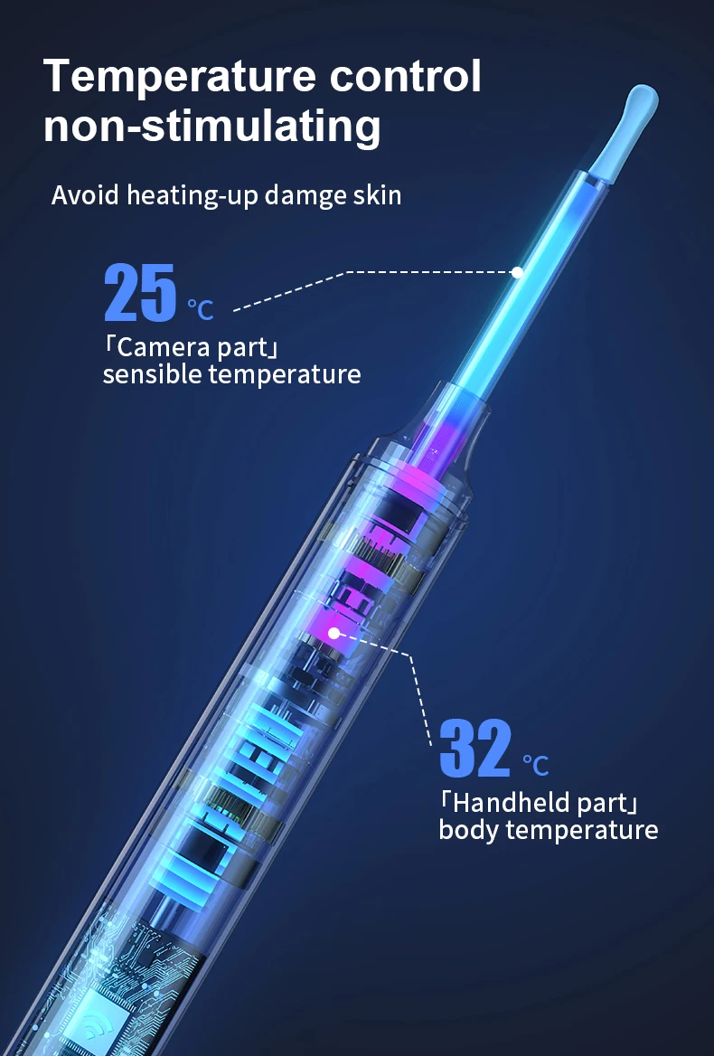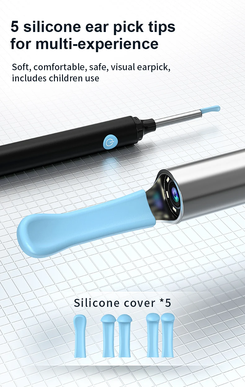 • Endoscopio de cámaras :Equipado con un endoscopio de cámara, Este limpiador de orejas permite la inspección visual del oído interno, Asegurar una limpieza precisa y completa.