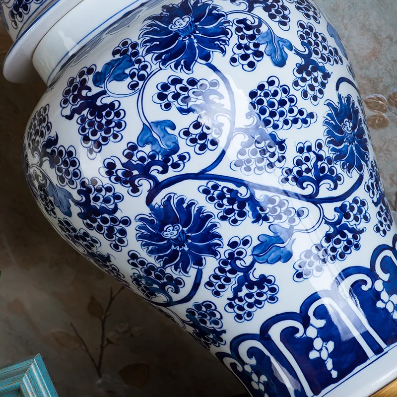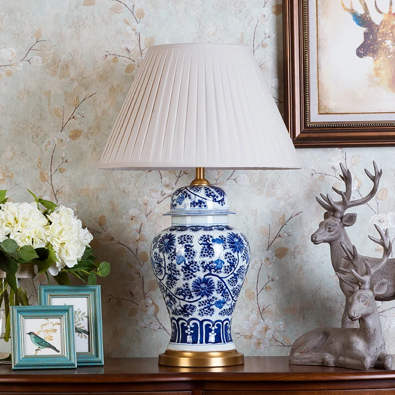 This content description refers to a small table lamp with a blue and white design featuring a tangled branch and lotus flowers on a ginger jar base. The lamp is compact in size, making it suitable for smaller spaces or bedside tables. The intricate design adds a touch of elegance and sophistication to any room. The blue and white color scheme is versatile and timeless, blending well with various decor styles. En general, this table lamp is a stylish and functional lighting option for enhancing the ambiance of a room.