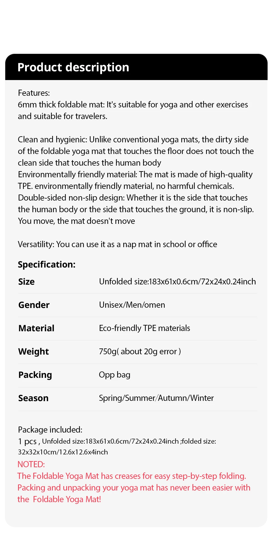 1.The Foldable Yoga Mat has creases for easy step-by-step folding Packing
