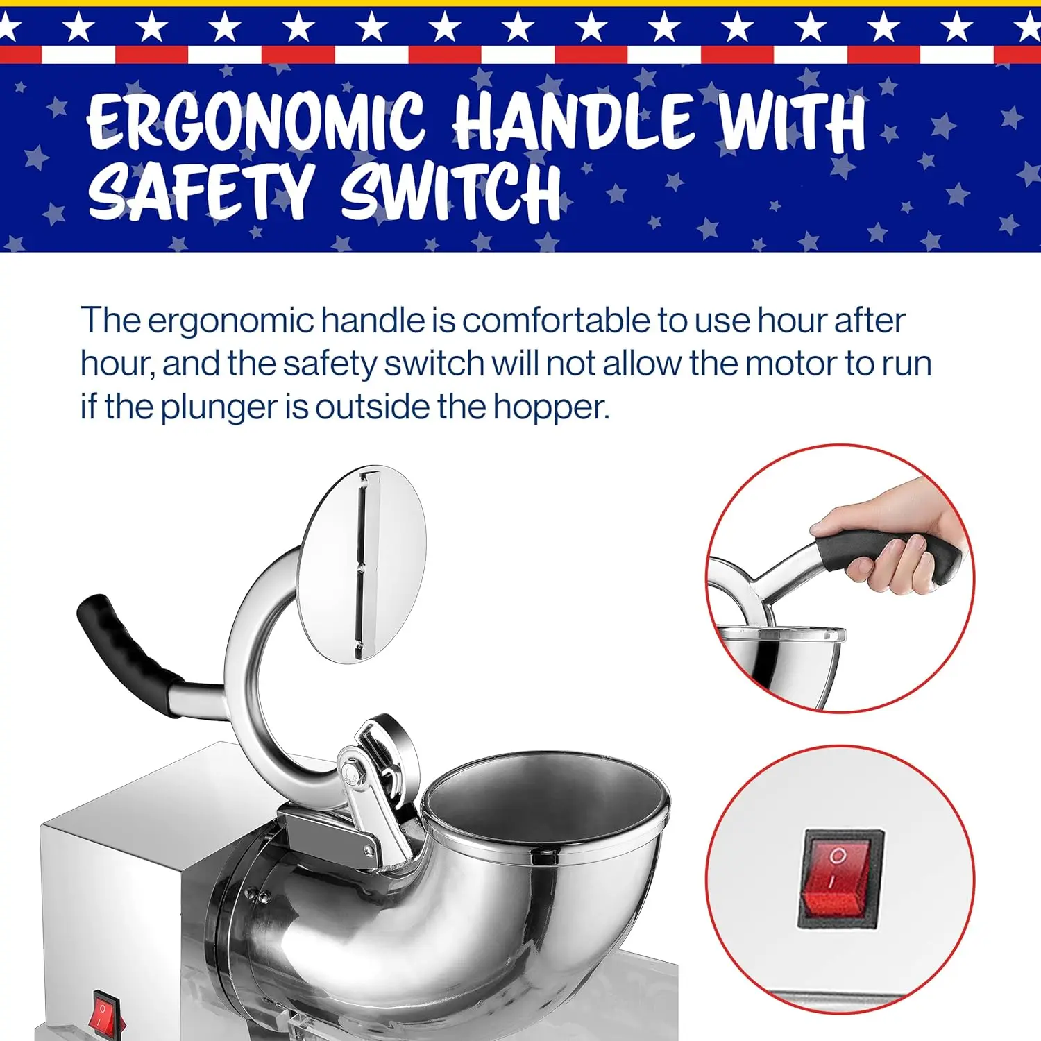 Características de seguridad: la máquina de cono de hielo está equipada con un botón de reinicio del motor en caso de mermeladas de hielo y un interruptor de seguridad que no permitirá que el motor funcione si el émbolo está fuera de la tolva, para que puedas hacer deliciosas golosinas afeitadas sin preocupación.
