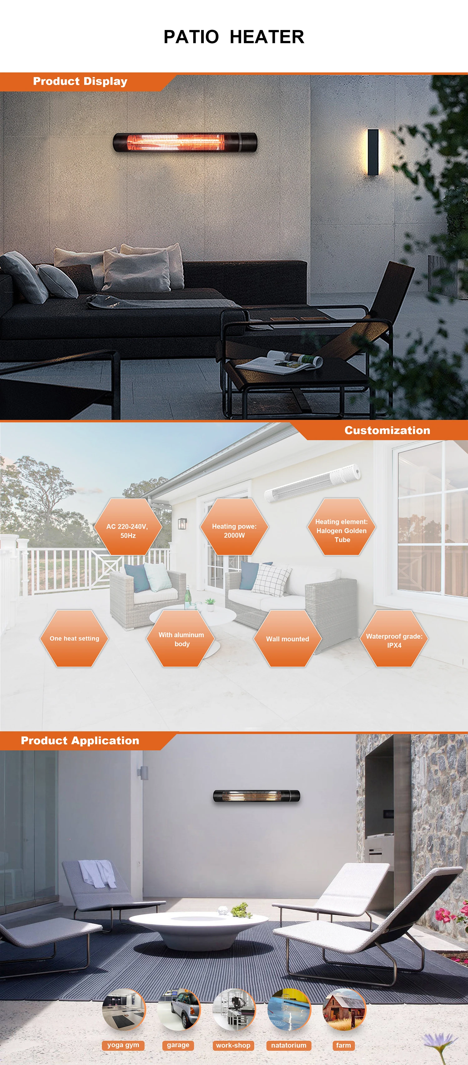 The Patio Outdoor Heater is an electric, infrared heater designed for home use. It has a power of 2000W and can be wall-mounted for convenience. The heater features a pull switch for easy operation and is suitable for outdoor use. With its infrared technology, this heater provides efficient and even heat distribution. Perfect for keeping your patio or outdoor space warm and cozy during chilly evenings.